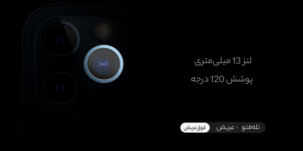 دوربین iPhone 12 Pro از سه لنز مجزا تشکیل شده است که بیرونزدگی بسیار کمی از قاب پشتی دارند و هر لنز دارای محافظ سرامیکی هستند که از آسیب به شیشه لنزها محافظت میکند. لنز 12 مگاپیکسلی عریض با گشودگی دیافراگم f/1.6، قابلیت فوکوس خودکار دوال پیکسل با تشخیص فاز و لرزشگیر اپتیکال تصویر که عملکرد آن در شب فوقالعاده است. تصاویر بسیار زنده و با وضوح بالا ثبت میشوند.