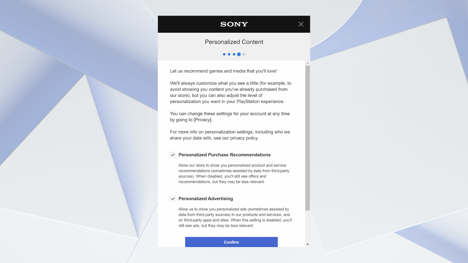 در گام بعد باید تصمیم خود مبنی بر اشتراکگذاری کلیه دادههای بازی با پلی استیشن را تعیین کنید. در ادامه باید انتخاب کنید که آیا قصد دارید توصیهها و تبلیغات فروشگاه شخصیسازی شده را داشته باشید. هم اکنون شرایط و سیاستهای استفاده از PSN را بررسی کنید، سپس کادر مخصوص را تایید کرده و گزینه Confirm را برای ادامه انتخاب کنید. شما باید آدرس ایمیل خود را با کلیک کردن روی کلید موجود در پیامی که پلی استیشن ارسال میکند، تایید کنید. پس از انجام این کار گزینه Already Verified را در کنسول خود انتخاب کنید.