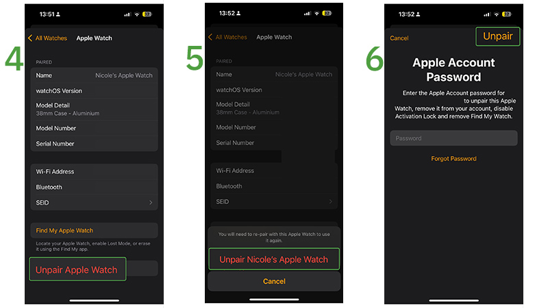 اگر قصد فروش اپل واچ خود را دارید، بهترین کار این است که از طریق Unpair کردن ساعت و آیفون نسبت به حذف اطلاعات و دادههای اپل واچ خود اقدام کنید. با این کار یک بکاپ کامل از اطلاعات ساعت به صورت خودکار روی آیفون شما ایجاد شده و قفل فعالسازی (Activation Lock) حذف خواهد شد که به شما اجازه میدهد مالکیت اپل واچ را به دیگری واگذار کنید. در این روش فرایند حذف اپل آیدی از اپل واچ به صورت خودکار انجام خواهد شد و نیاز به انجام کار دیگهای نیست. برای استفاده از این روش کافی است مراحل زیر را طی کنید: