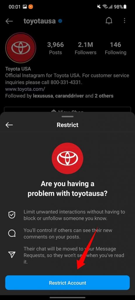 حالت Restrict: برخی از افراد حالت بالا را دارند اما به تعداد زیاد دایرکت میفرستند و یا زیر پستهای ما کامنت میگذارند که این میتواند بسیار آزار دهنده باشد. برای این دسته از افراد قابلیت Restrict وجود دارد که قویتر از Mute بوده و میتواند خیال شما را از بابت کامنت و دایرکت هم راحت کند. اگر برای فردی این قابلیت را روشن کنید نه تنها پست و استوریهای او برای شما نمایش داده نمیشود بلکه کامنتهای او هم بدون تأیید شما نمایش داده نمیشود و دایرکتهای او نیز به بخش دایرکت رکوئست منتقل میشود و میتوانید بدون این که متوجه شود دایرکتهای او را مشاهده کنید. برای این کار کافیست به پروفایل فرد مورد نظر بروید و روی گزینهی Following کلیک کنید تا پنجرهای باز شود و سپس از آن پنجره گزینهی Restrict را انتخاب کنید.