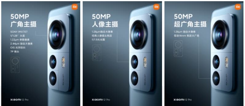در پنل پشتی شیائومی 12 پرو ماژول دوربین سهگانهای قرار گرفته که از دوربین اصلی ۵۰ مگاپیکسلی با حسگر IMX707 سونی استفاده میکند. این دوربین از سایز حسگر ۱/۱.۲۸ اینچی، سایز پیکسل ۲.۴۴ میکرومتری و OIS استفاده میکند. دوربین دیگر که از لنز اولتراواید استفاده میکند نیز دارای لنز اولتراواید بوده و دوربین سوم از لنز پرتره برای سنجش میزان عمق در تصویر استفاده میکند. درواقع ماژول دوربین اصلی شیائومی ۱۲ پرو از سه دوربین ۵۰ مگاپیکسلی تشکیل مییابد.