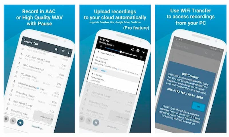 Tape-a-Talk خود را با ویجتی متمایز میکند که به شما امکان میدهد مستقیما از صفحه اصلی ضبط کنید. میتوانید ضبطهای خود را در گوگل درایو، دراپباکس، مایکروسافت وان درایو و باکس کلود ذخیره کنید. ویژگیهای بیاهمیت اما سرگرمکننده شامل امکان تغییر رنگبندی برنامه و تنظیم یک صدای ضبط شده به عنوان آهنگ زنگ است. این برنامه بهترین برنامه ضبط مکالمه دوطرفه اندروید نیز هست.