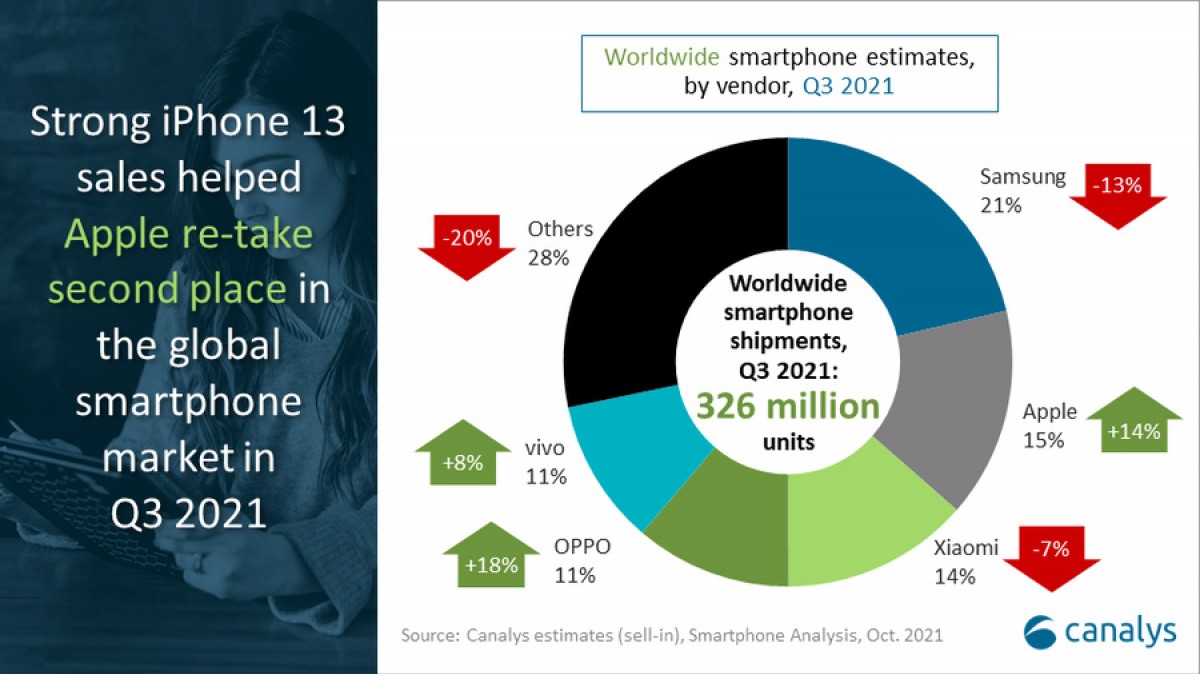 دادههای منتشر شده از سازمان تحلیلی کانالیس نشان میدهند که اپل توانسته به جایگاه پیشین خود بازگشته و طی سهماهه سوم سال ۲۰۲۱ بیشتر از شرکت شیائومی فروش داشته باشد. درواقع فروش ۴۹.۲ آیفون به اپل کمک کرده تا به دومین شرکت پرفروش گوشی هوشمند طی سهماهه سوم سال ۲۰۲۱ تبدیل شود که دستاوردی درخور توجه محسوب میشود.