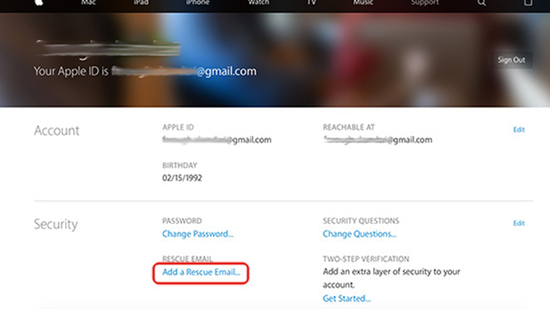 2. روی گزینه Security کلیک کنید و سپس در قسمت Security روی Add a Rescue Email کلیک کنید.