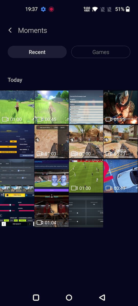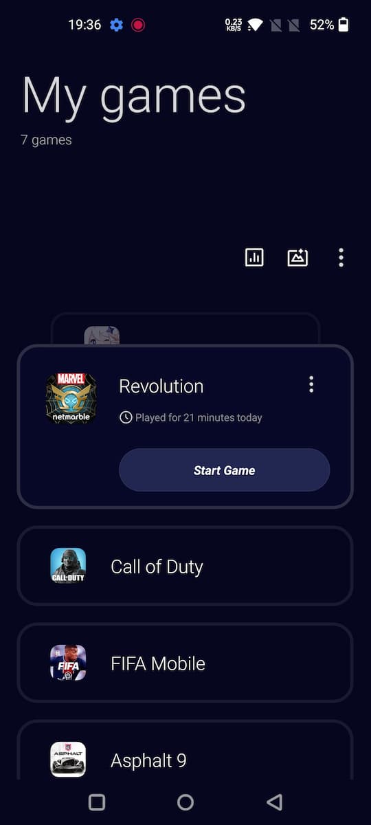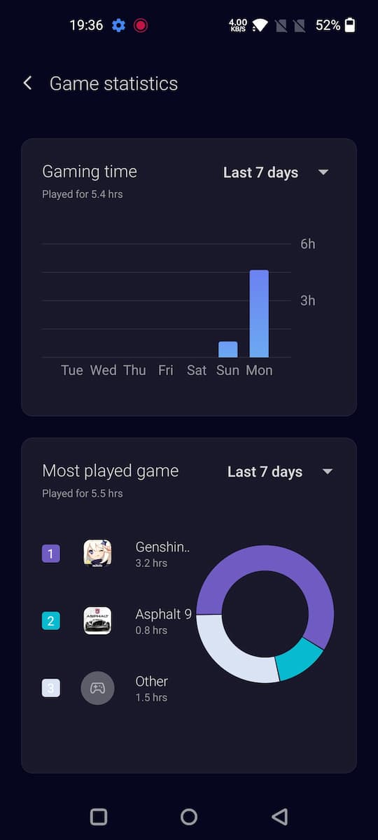 از ویژگیهای دیگر اپلیکیشن Games بخش آمار آن است که به شما اطلاعاتی را در مورد میزان ساعاتی که بازیهای مختلف را تجربه کردهاید، ارائه میدهد. در زمان اجرای بازی نیز میتوانید به منویی دسترسی داشته باشید که اطلاعات مفیدی ازجمله میزان شارژ باقیماندهی باتری، میزان دمای دستگاه و ساعت را در اختیارتان قرار میدهند. قسمت دیگر این منو نیز شامل امکاناتی میشود که به آنها دسترسی سریع خواهید داشت. این امکانات عبارتاند از میزان روشنایی صفحهنمایش، فعالسازی حالت پرو، ضبط ویدئو از گیم پلی بازی و موارد دیگر.