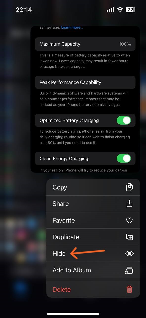 از این منو گزینهی Hide را انتخاب کرده و تایید کنید که میخواهید این موارد پنهان شوند. برای تماشای موارد پنهان شده باید به بخش Albums در Photos بروید و به روی Hidden در پایین صفحه کلیک کنید. برای باز کردن این بخش، گوشی از فیس آیدی کمک میگیرد و البته میتوانید Passcode خود را نیز وارد کنید.