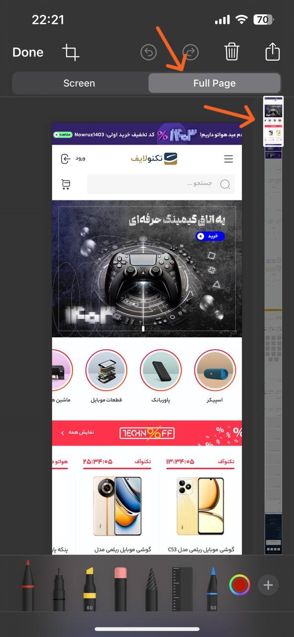 برای گرفتن اسکرین شاتهای طولانی از یک وبسایت یا برنامهای که اطلاعاتی طولانی دارد تنها کافیست به حالت عادی اسکرین شات ذخیره کنید و پس از آن از طریق گزینهی Full page و اسکرول کردن به پایین تا هر کجای صفحه را که دوست دارید در یک اسکرین شات قرار دهید.