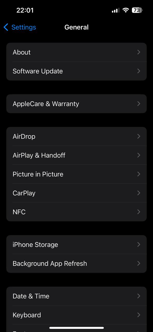به ادامه بخش General برگردیم، جایی که گزینه Fonts به شما اجازه میدهد فونت گوشی را تغییر دهید و گزینه Language & region برای تعیین زبان و منطقه ایفون است. در انتهای این صفحه گزینه Transfer or reset iPhone به شما اجازه میدهد تا دیتای گوشی را حذف کنید یا به ایفون دیگری انتقال دهید و در نهایت Shut Down گوشی شما را خاموش خواهد کرد.