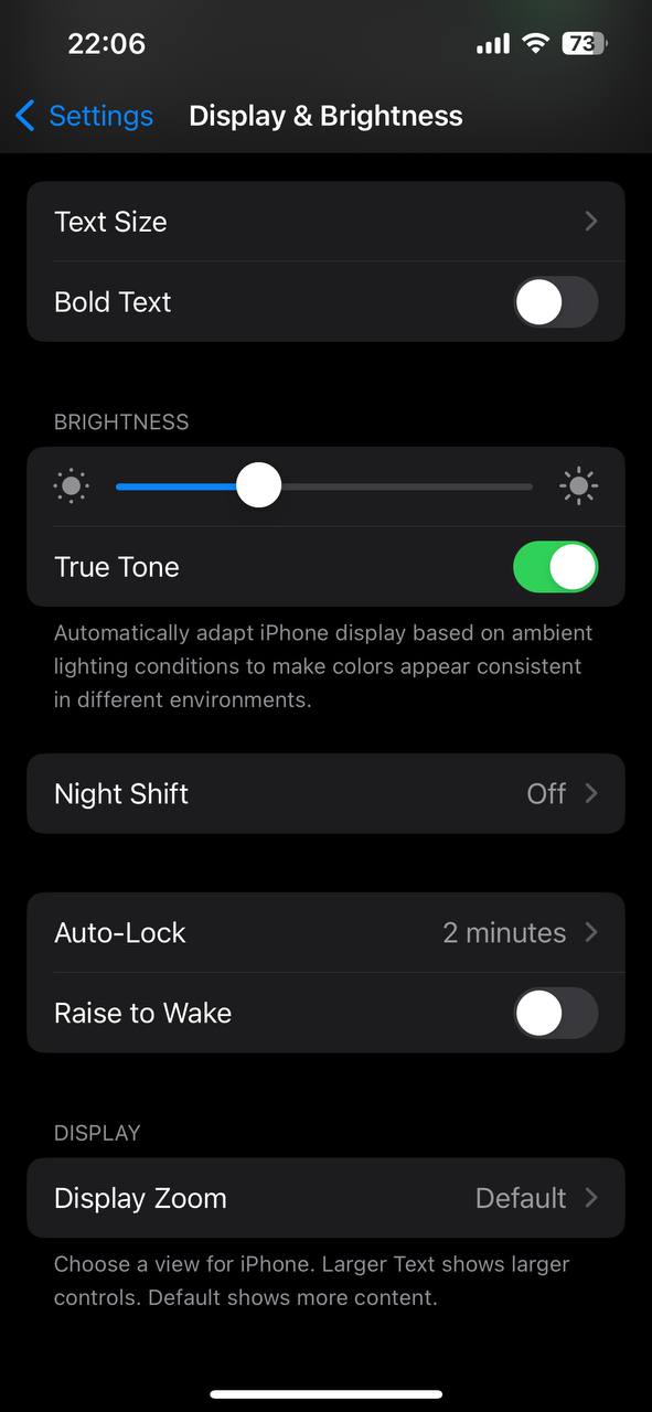 گزینه Text size به شما اجازه میدهد تا سایر متون را تغییر دهید و گزینه Bold text متون را ضخیمتر میکند. نوار بعدی مربوط به تنظیم روشنایی نمایشگر است و گزینه True Tone نیز در صورت روشن بودن به صورت دائمی دمای نمایشگر را بسته به میزان نور محیط تنظیم میکند تا بهترین تجربه از تماشای محتوا حاصل شود.