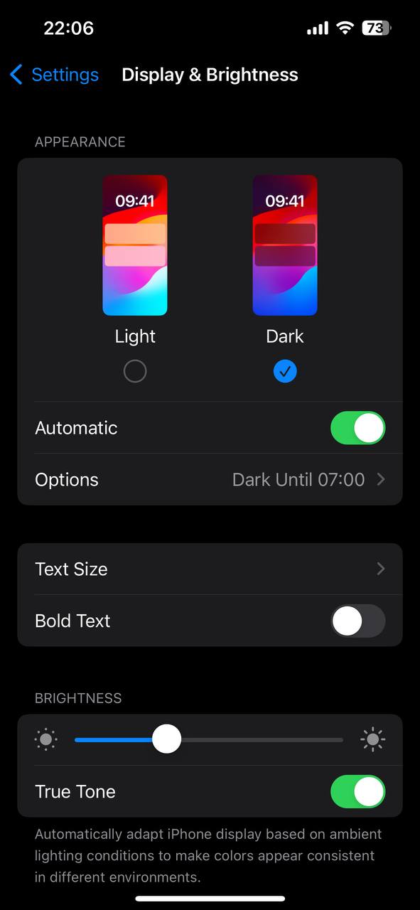 اولین گزینه این بخش به شما امکان میدهد تا ظاهر آیفون را بین دو حالت Light و Dark انتخاب کنید. از طریق گزینه Automatic میتوانید روشن شدن دارک مود را طبق برنامه خاصی تنظیم کنید. برای نمونه مشخص کنید که دارک مود هر روز ساعت ۱۷ روشن شود و ساعت ۷ صبح فردا خاموش شود.