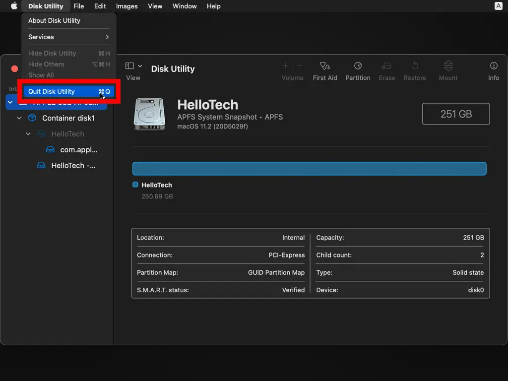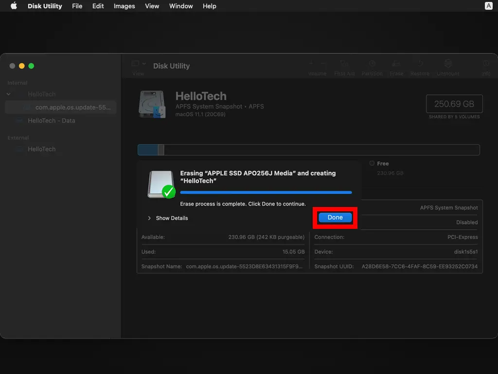 6. با کلیک کردن روی Erase در گوشه سمت راست پایین پنجره پاپآپ را مشاهده خواهید کرد. چند دقیقه صبر کنید تا ریست فکتوری مک بوک تمام شود سپس روی گزینه Done بزنید. بعد از گذراندن این مرحله مجدد روی Disk Utility کلیک کنید و روی Quit Disk Utility بزنید. با انجام مراحل فوق به پاپ اولیه برمیگردید و درصورتی که نیاز به نصب مجدد macOS دارید میتوانید با انتخاب گزینه Reinstall macOS این کار را انجام دهید.