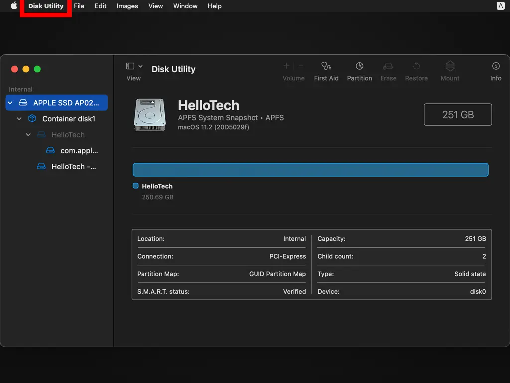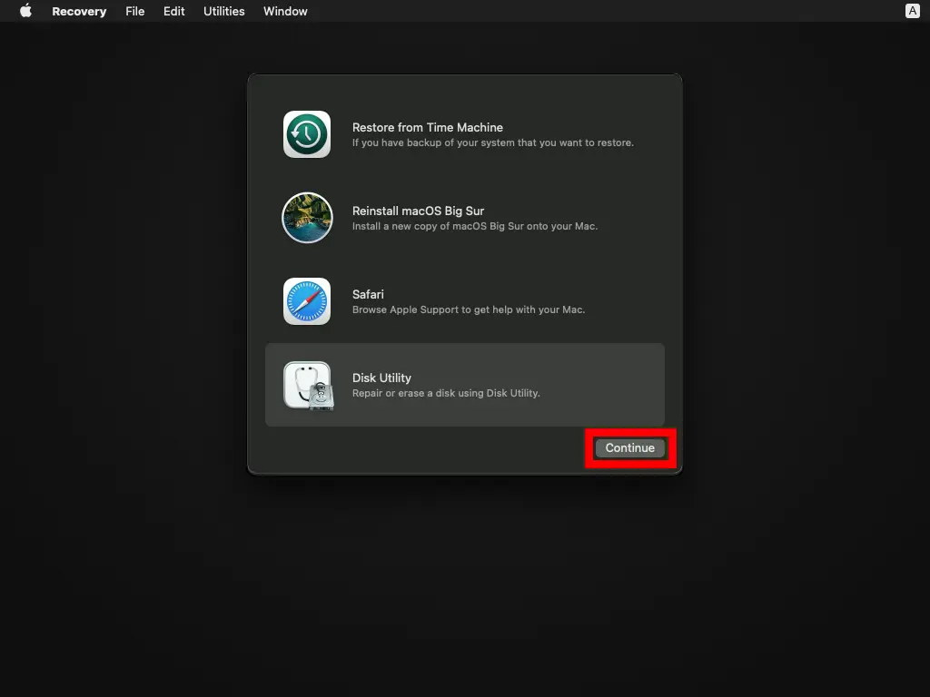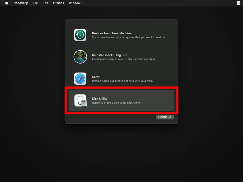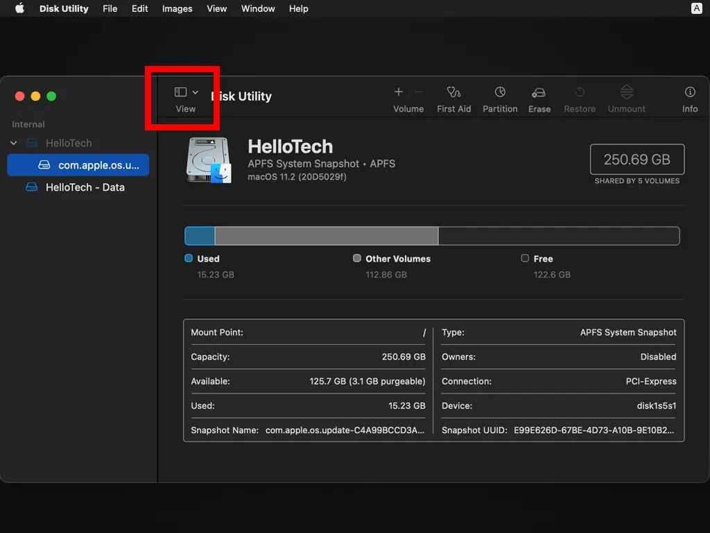 2. پس از گذراندن مرحله فوق در پاپآپ ظاهر شده روی Disk Utility بزنید و Continue را انتخاب کنید. داخل منوی Disk Utility روی View بزنید. دکمه View را در گوشه سمت چپ بالای پنجره خواهید دید. پس از کلیک روی آن، منوی کشویی ظاهر میشود.