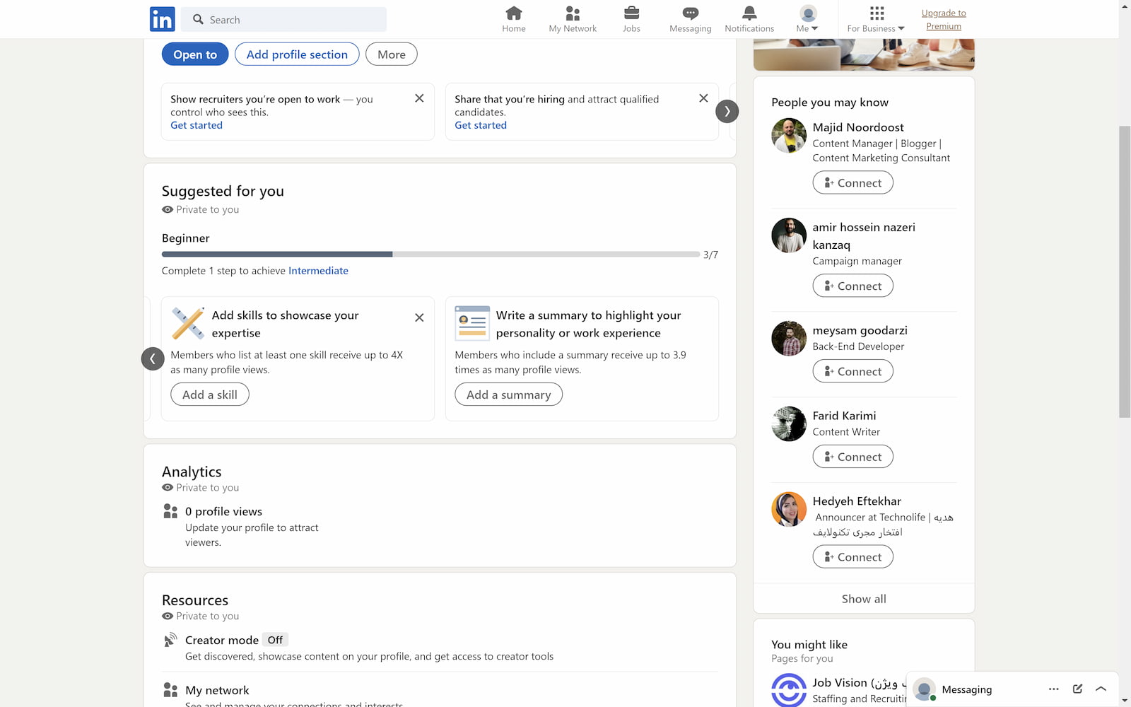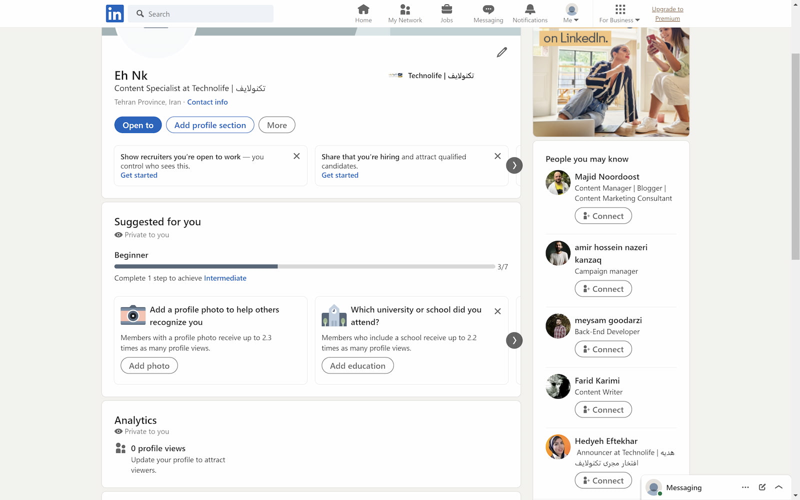 همانطور که در تصویر زیر مشاهده میکنید خود لینکدین به شما پیشنهاد میدهد که برای کامل شدن پروفایل خود چه کارهایی باید انجام دهید. برای مثال اگر هنوز عکس آپلود نکردهاید در اولین قدم یک عکس پروفایل مناسب برای اکانت خود در نظر بگیرد.