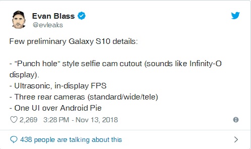 اطلاعات جدید حاکی از آن است که سامسونگ در این گوشی هوشمند از صفحه نمایش ناچ مدل O استفاده خواهد کرد که اگر این موضوع حقیقت داشته باشد، گلکسی S10 به عنوان اولین گوشی هوشمند از کمپانی سامسونگ با صفحه نمایش ناچ خواهد بود. در ادامه پیام این لیکر، نام Ultrasonic و Indisplay دیده می شود که بیانگر آن است، این کمپانی از اسکنر اثر انگشت Ultrsonic داخل صفحه نمایش استفاده خواهد کرد که محصول کمپانی کوالکام است.