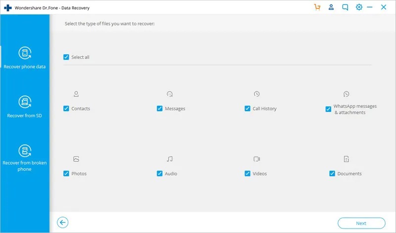پس از اتصال موفقیت‌آمیز گوشی موبایل، Dr.Fone for Android انواع داده‌هایی را که برای بازیابی پشتیبانی خواهد کرد، نمایش می‌دهد. به صورت پیش‌فرض، انواع فایل‌ها را بررسی کرده است. شما می‌توانید نوع داده‌ای که می‌خواهید بازیابی شود را انتخاب کنید. در ادامه روی گزینه ادامه (Next) کلیک کنید تا روند بازیابی اطلاعات، ادامه پیدا کند. توجه داشته باشید که این برنامه در ابتدای کار، دستگاه شما را مورد تجزیه و تحلیل قرار خواهد داد.