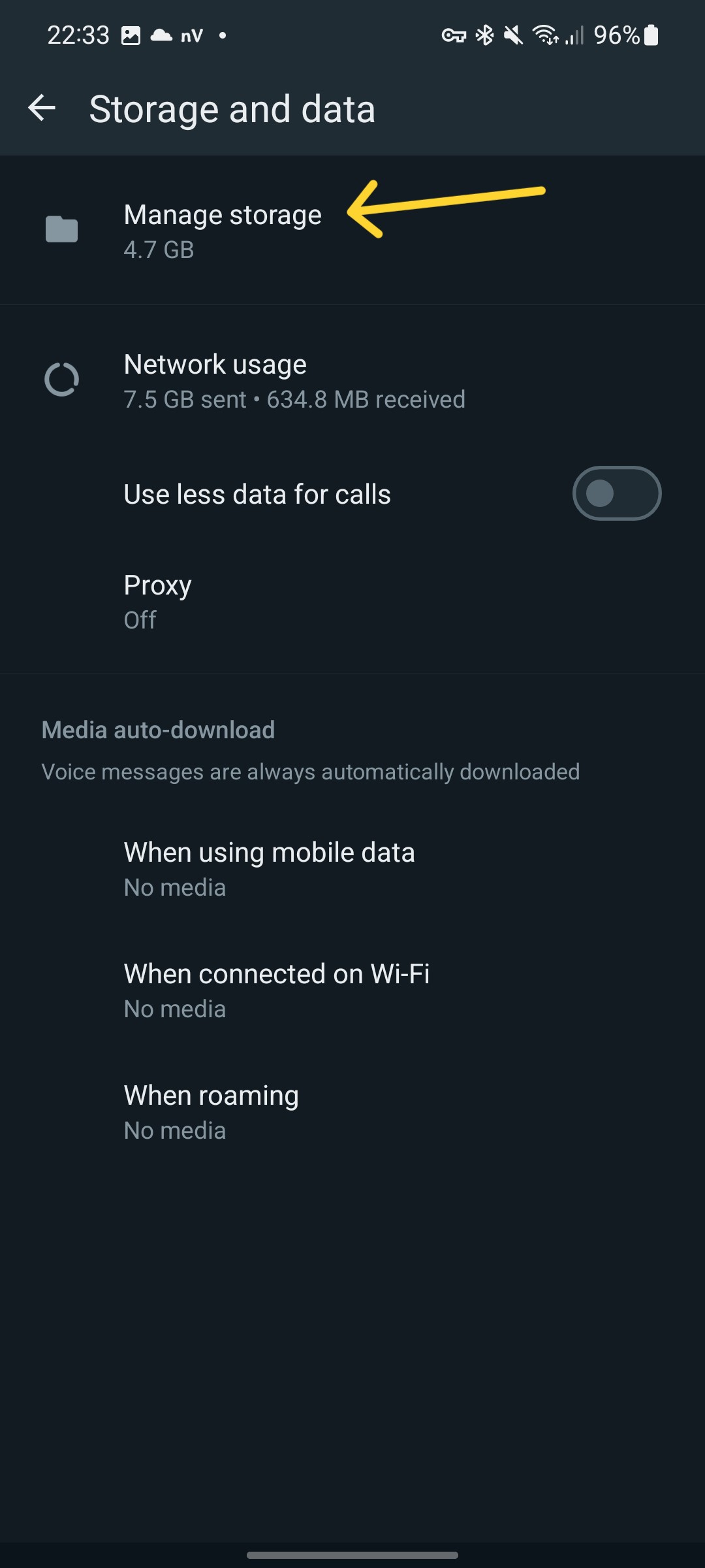 در این مرحله Storage and data را انتخاب کرده و به بخش Manage storage مراجعه کنید. در اینجا به شما نشان داده میشود که کدام چتها یا گروههای واتس اپ داده بیشتری را به خود اختصاص دادهاند. از این طریق شما میتوانید بسته به میزان استفاده از واتس اپ بین ۱ تا ۱۰ گیگابایت حافظه داخلی (و حتی در برخی مواقع بیشتر) را آزاد کنید (این مراحل برای گوشیهای مختلف کاملا یکسان است).