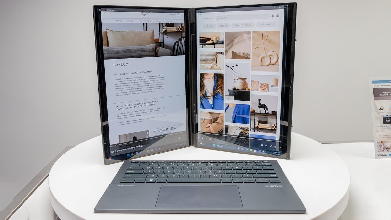 یکی از خاصترین لپ تاپهای کل بازار همین مدل Zenbook Duo UX8406MA Ultra 9 185H از شرکت ایسوس است که خلاقیت و نوآوری را به نقطه اوج رسانده و به شما کمک میکند تا با خرید یک محصول بتوانید چندین نوع استفاده از آن داشته باشید. این محصول دارای دو صفحه نمایش ۱۴ اینچی لمسی از نوع OLED با رزولوشن بسیار خوب 3K و نرخ نوسازی ۱۲۰ هرتزی است و به شما امکان میدهد تا بتوانید از آن هم به عنوان تبلت، هم لپ تاپ و هم مانیتوری برای تماشای محتوا و ارائه کرده پروژه استفاده کنید.