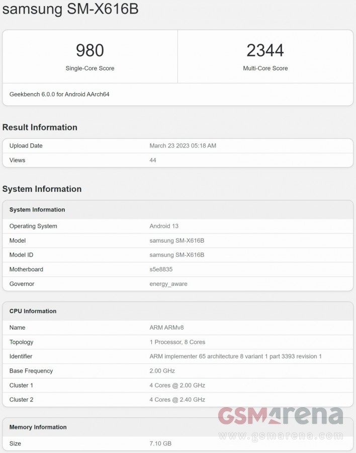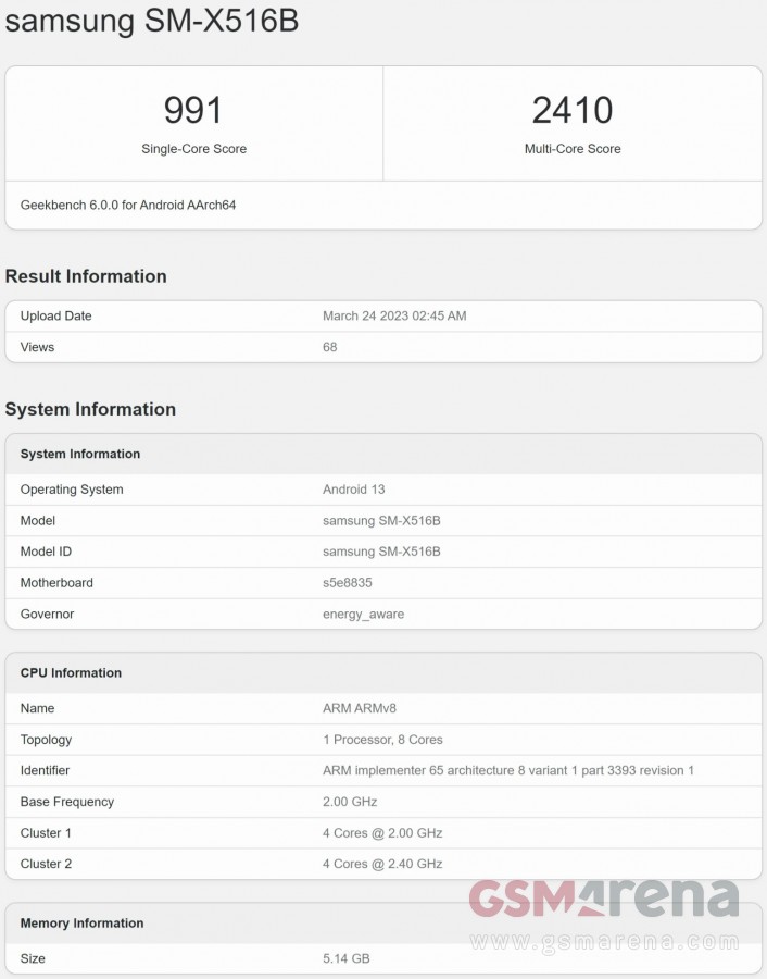 هر دو دستگاه، از تراشه‌ اگزینوس ۱۳۸۰ استفاده می‌کنند و سیستم عامل آن‌ها اندروید ۱۳ است. البته تفاوتی در ظرفیت رم آن‌ها وجود دارد. مدل SM-X516B از ۶ گیگابایت رم استفاده می‌کند و SM-X616B مجهز به ۸ گیگابایت رم است. امتیاز دو دستگاه نیز یکسان نیست و SM-X516B امتیاز بالاتری گرفته است اما نمی‌توان زیاد به این امتیازها اعتماد کرد و بهتر است منتظر باشیم تا مدل‌های ذکر شده وارد بازار شوند. بدین صورت، عملکرد آن‌ها را می‌توانیم اصولی بررسی کنیم. با این حال اطلاعات منتشر شده از این تبلت‌ها در بنچمارک GeekBench را می‌توانید در تصاویر زیر مشاهده کنید: