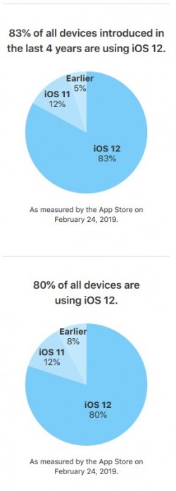 چندی پیش کمپانی اپل از دوازدهمین نسخه سیستم عامل خود (iOS 12) را معرفی کرد. حال نموداری در رابطه با درصد استفاده کاربران از سیستم عامل های این برند منتشر شده که در ادامه آن را بررسی می کنیم. طبق نمودار منتشر شده، تا تاریخ 24 فوریه در حدود 83 درصد از کاربران گوشی های چهار سال اخیر این برند از iOS 12 استفاده می کنند. در حدود 12 درصد دیگر از سیستم عامل iOS 12 و مابقی از سیستم عامل iOS 10 استفاده می کنند. اما این موضوع در حالی است که 80 درصد از کلیه کاربران آیفون از iOS 12 و 12 درصد از iOS 11 و 8 درصد مابقی از سیستم عامل iOS 10 استفاده می کنند.