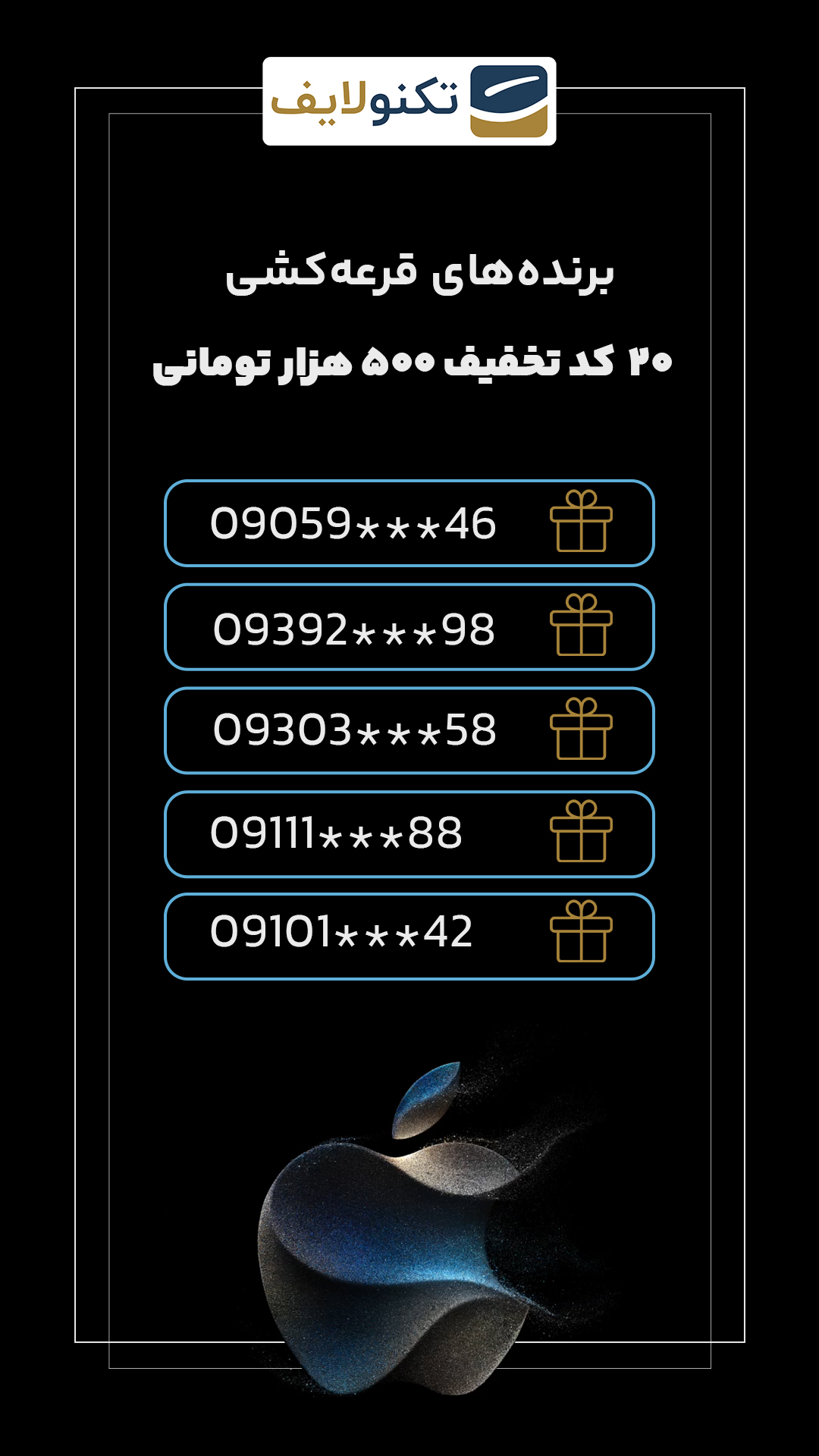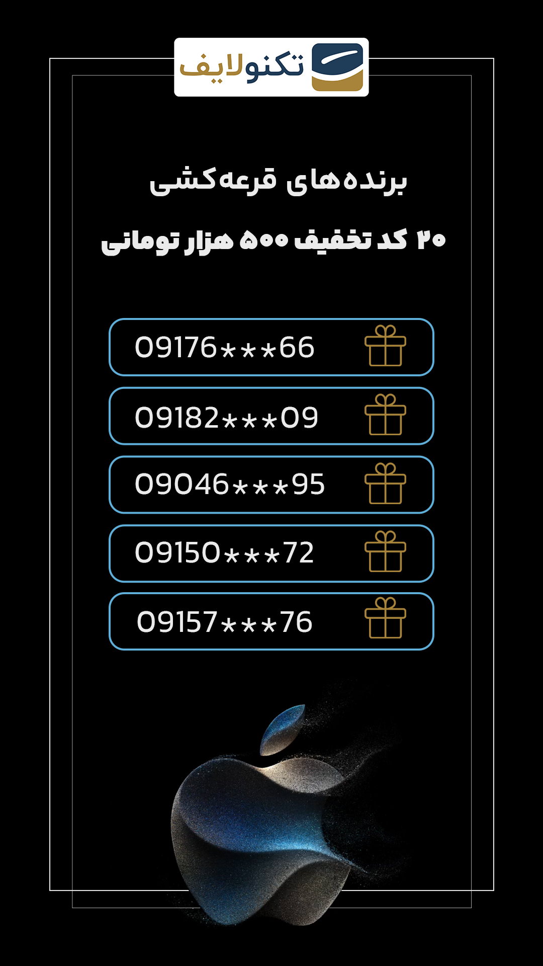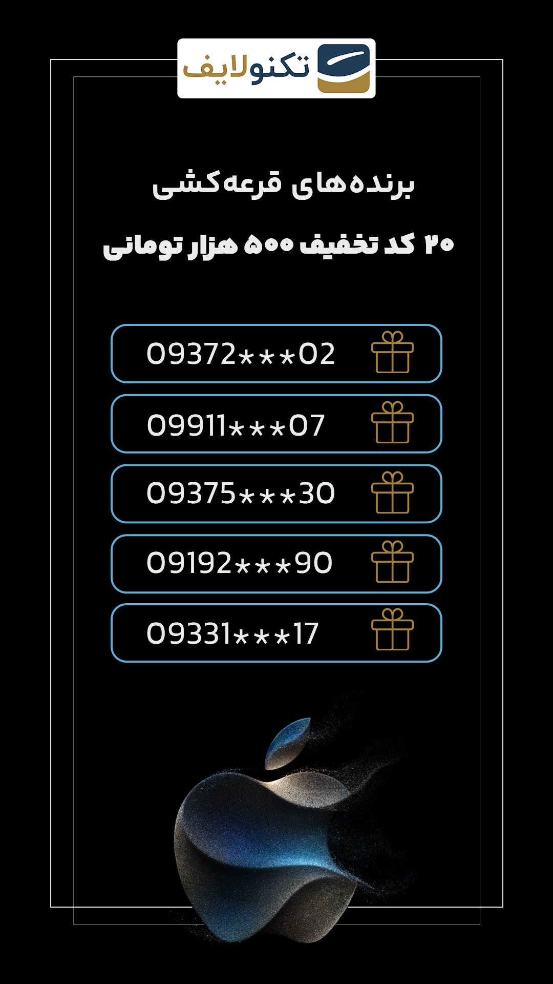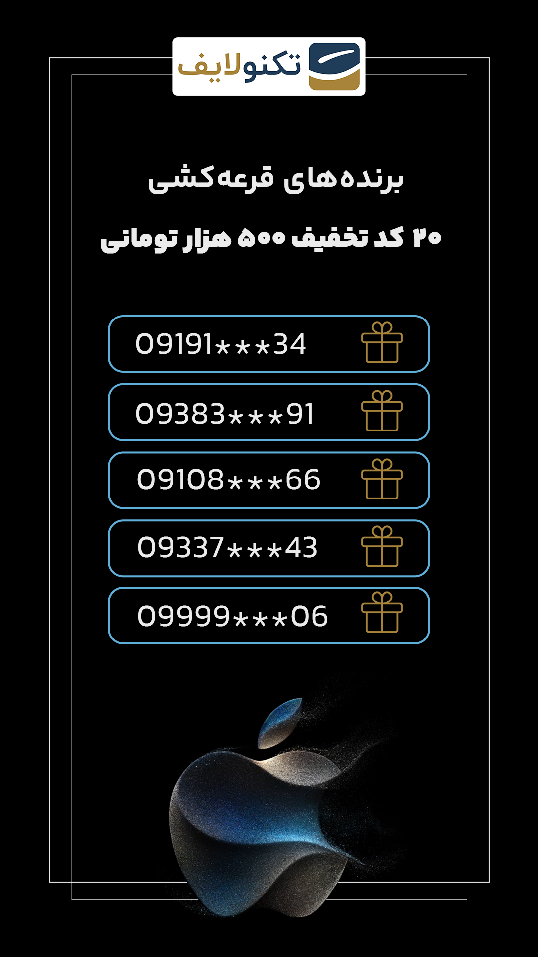شب گذشته پس از برگزاری مراسم رونمایی از آیفون ۱۵، بین افرادی در قرعهکشی برای برنده شدن آیفون ۱۵ شرکت کرده بودند، قرعهکسی شد و برنده مشخص شد. پارسا غلامعلی زاده برنده آیفون ۱۵ از تکنولایف شد.