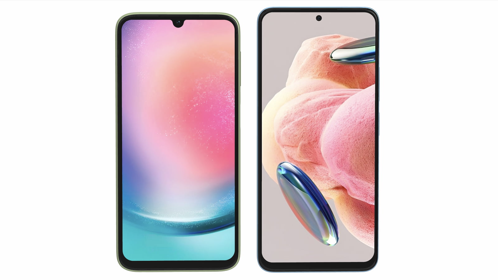 به عنوان آخریش بخش بد نیست فریم روبرویی دو محصول را نیز با هم مقایسه کنیم. گلکسی A24 نمایشگری 6.5 اینچی دارد و توانسته 82 درصد از نمای روبرویی را به خود اختصاص دهد. دوربین سلفی این مدل درون یک ناچ قطرهای بالای نمایشگر دیده میشود. در سوی دیگر ردمی نوت 12 پنلی 6.67 اینچی دارد که 85 درصد از نمای روبرویی را به خود اختصاص داده است.