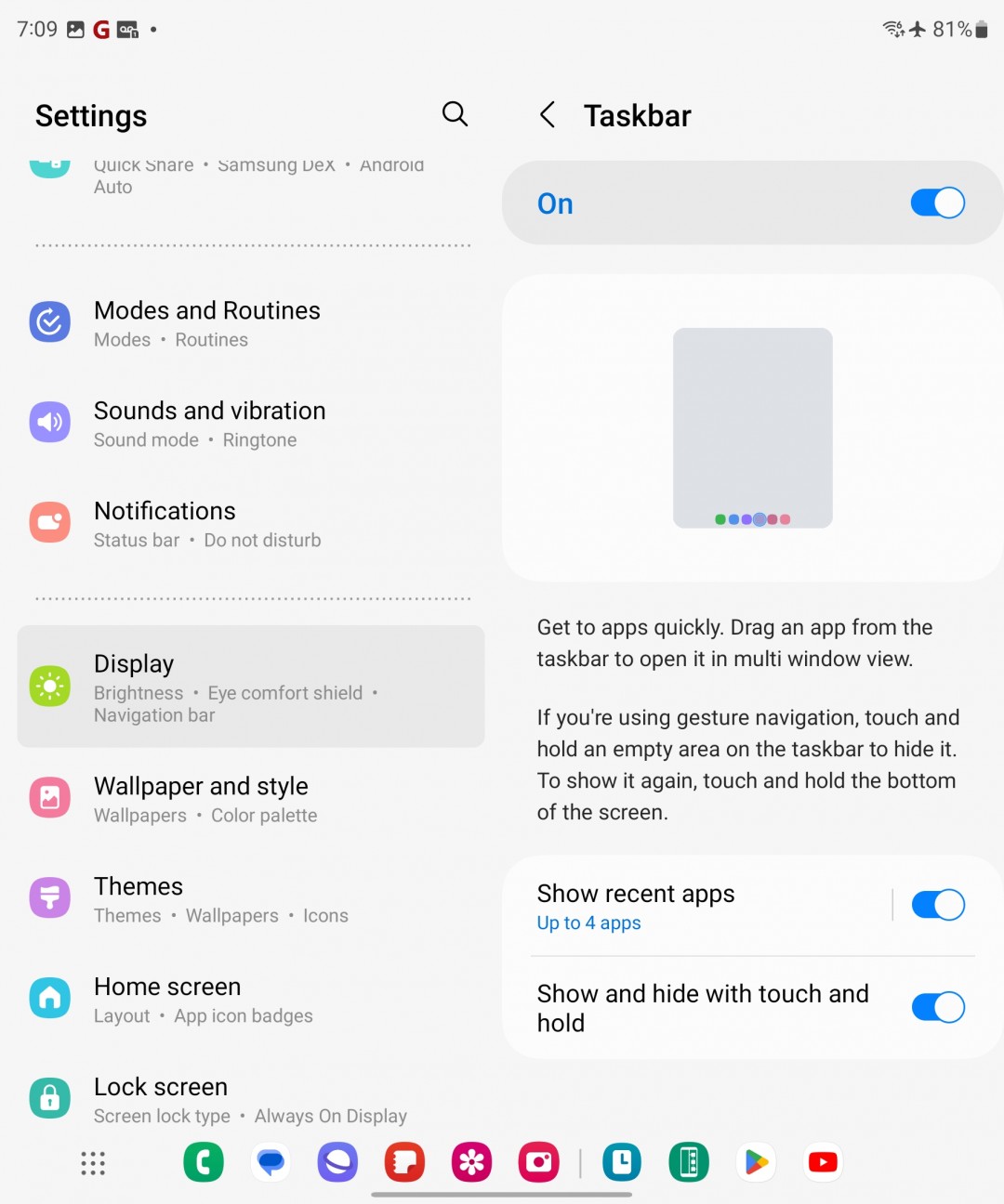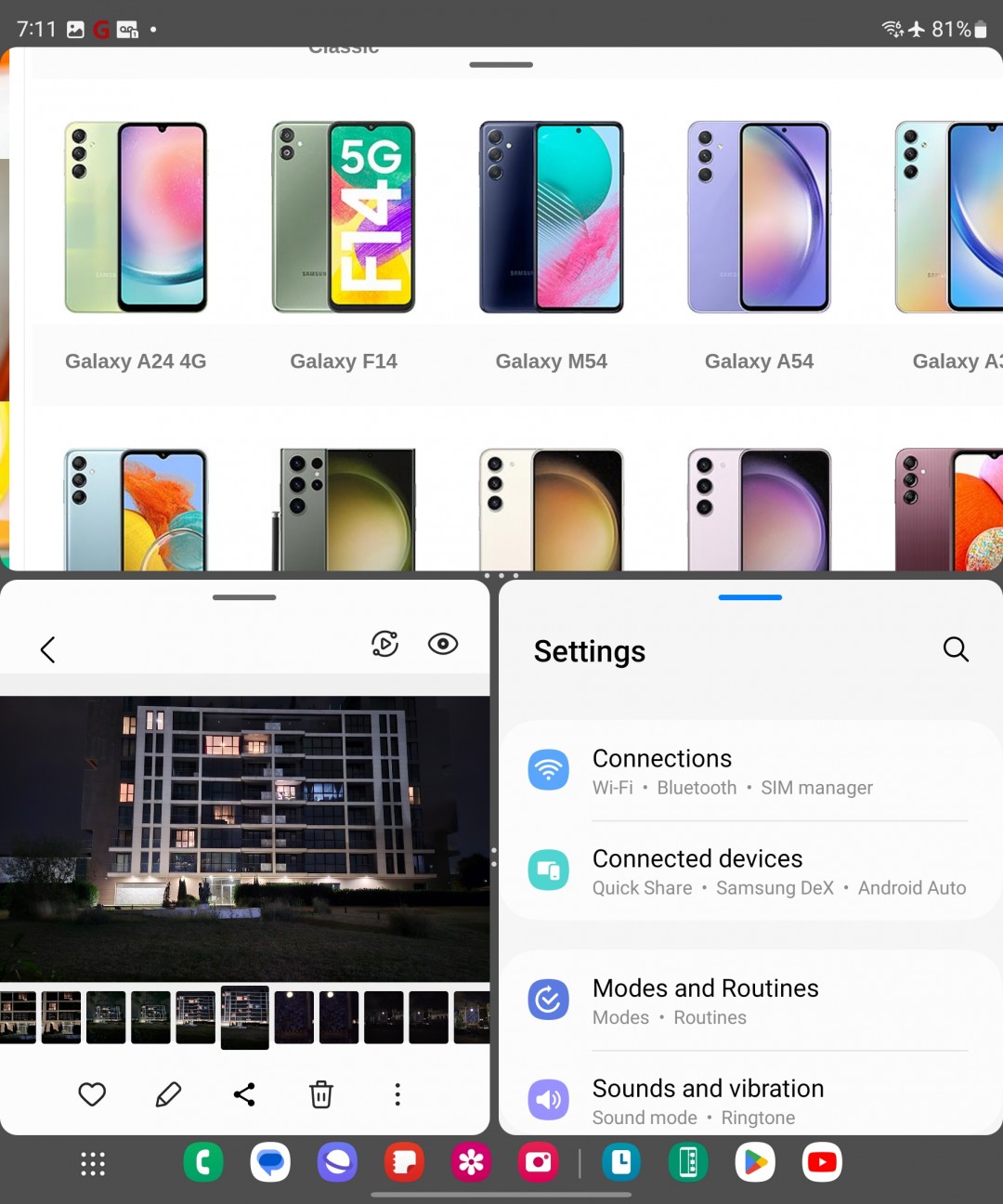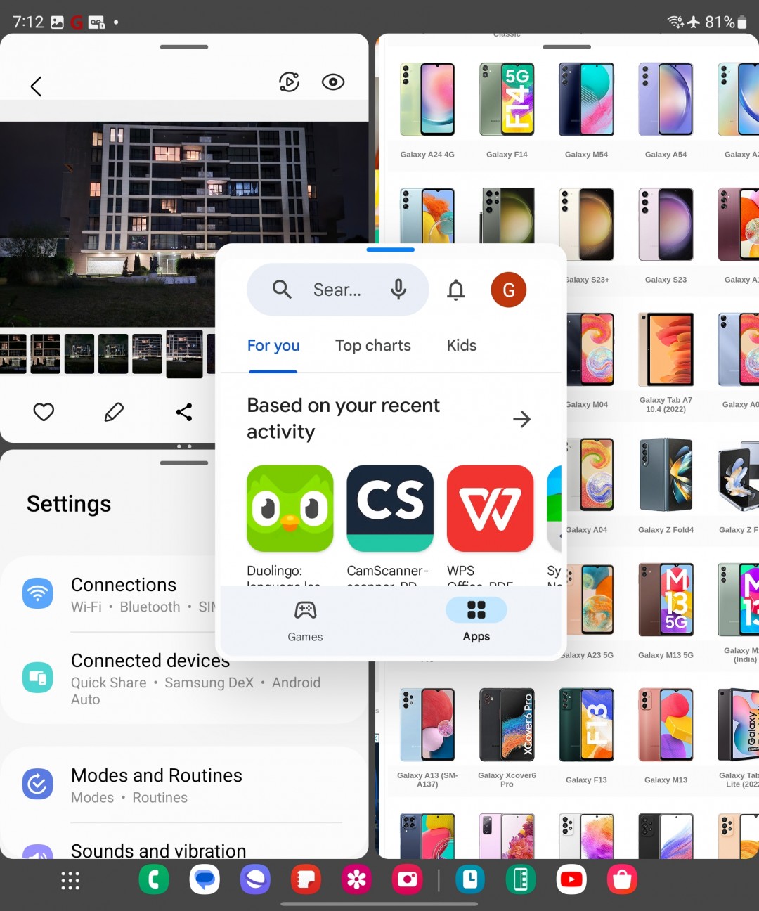 رابط کاربری One UI و اندروید به روی گوشی تاشو مقداری با گوشیهای معمول تفاوت دارد و قابلیتهای متفاوتتر و کاملتری را در دسترس قرار میدهد. برای نمونه در حالت باز بودن گوشی شما به تسک بار دسترسی خواهید داشت، دقیقا مانند اتفاقی که در ویندوز یا مک یا تبلتها شاهد آن هستیم. قابلیتهای مولتی تسکینگ نیز در این دو مدل به اوج میرسد و شما میتوانید ۴ برنامه را در کنار هم داشته باشید و تا ۴ برنامه را نیز به صورت شناور باز کنید تا تعداد کلی به عدد عالی ۸ برسد.