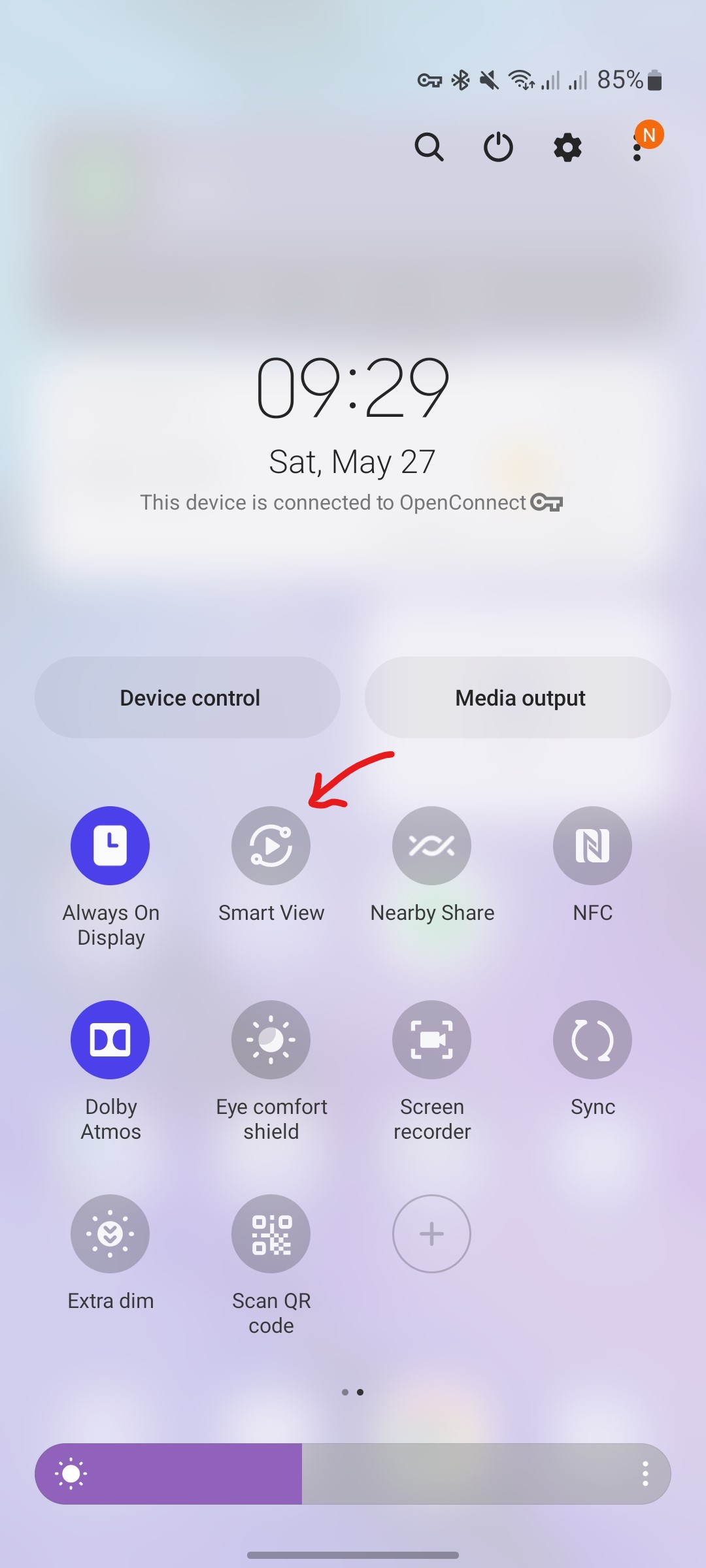 اتصال گوشی به تلویزیون با smart view چگونه است؟ از کنترل سنتر گوشی سامسونگ خود باید این گزینه را انتخاب کنید. از طرفی تلویزیون را هم روشن کرده و در حالت آماده به کار قرار دهید. در ادامه به روی نام تلویزیون در گوشی کلیک کنید تا اتصال برقرار شود.
