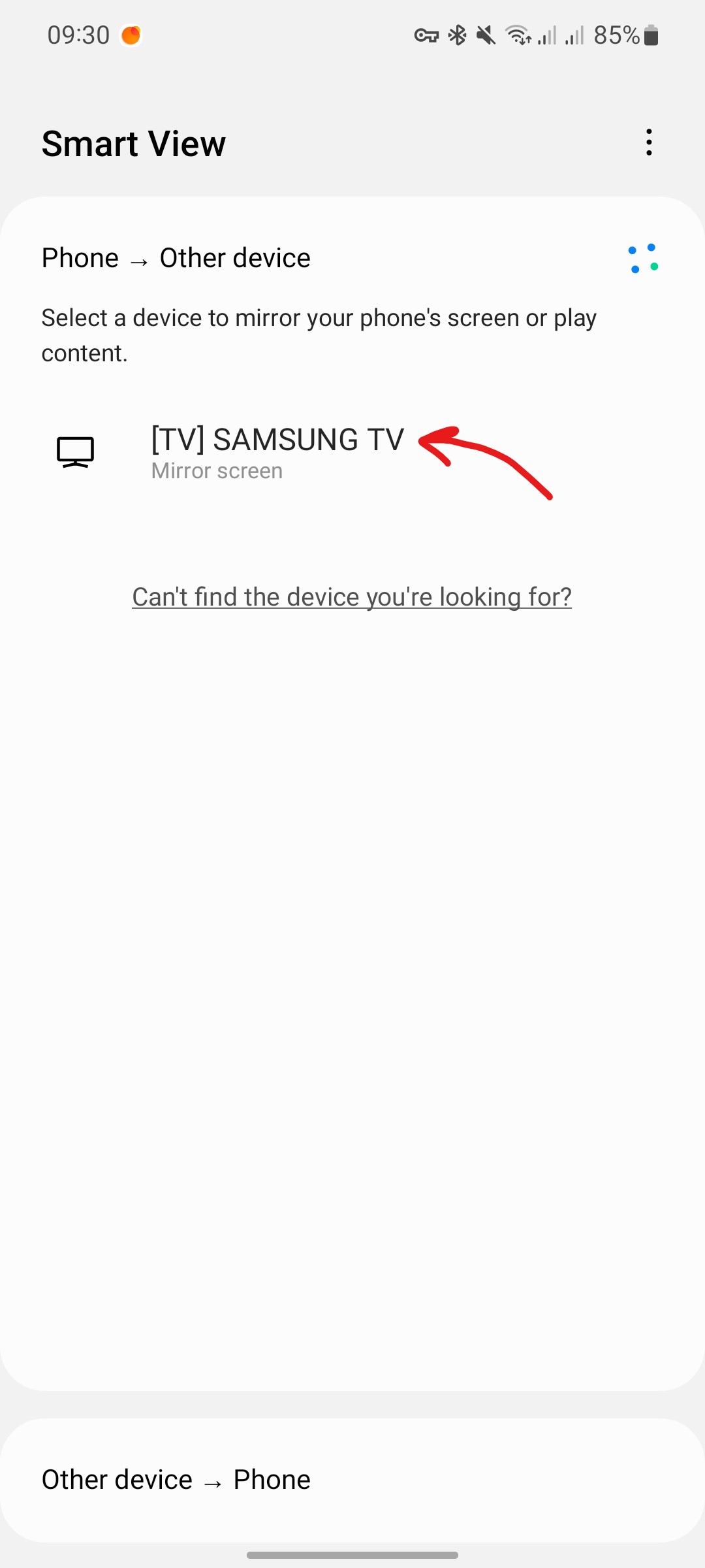 در نظر داشته باشید که نحوه اتصال گوشی سامسونگ a13 به تلویزیون از طریق توضیحات بالا امکانپذیر نیست؛ چرا که به روی این گوشی قابلیت Smart View دیده نمیشود. شما میتوانید در این گوشی و مدلهای دیگری که فاقد قابلیت Smart View هستند از روشهای گفته شده در ادامه استفاده کنید.