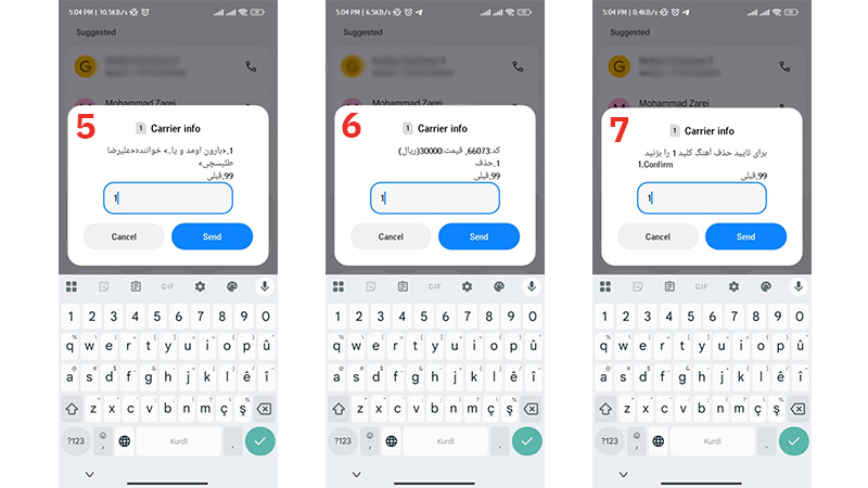 2. سپس عدد 1 که مربوط به آهنگ پیشواز است را وارد کرده و گزینه Send را بزنید؛