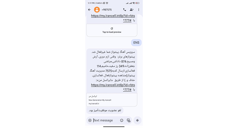 نحوه لغو آهنگ پیشواز ایرانسل از طریق پیامک بسیار ساده است و تنها کافی است یک کد را به سرشماره 7575 ارسال کنید. البته در نظر داشته باشید که از طریق پیامک میتوانید بین چند حالت مختلف یکی را انتخاب کنید که در ادامه به هر کدام از این موارد خواهیم پرداخت: