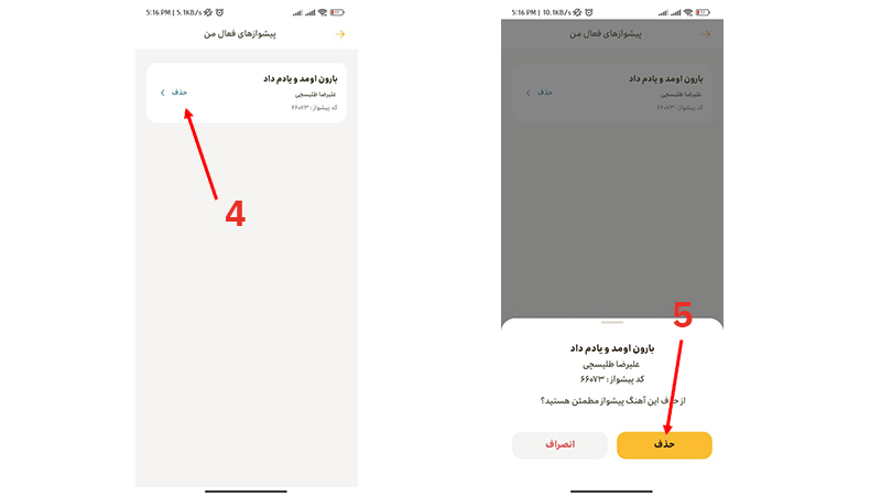 4. در این مرحله باید گزینه حذف که جلوی آهنگ پیشواز انتخابی شما وجود دارد را بزنید؛
