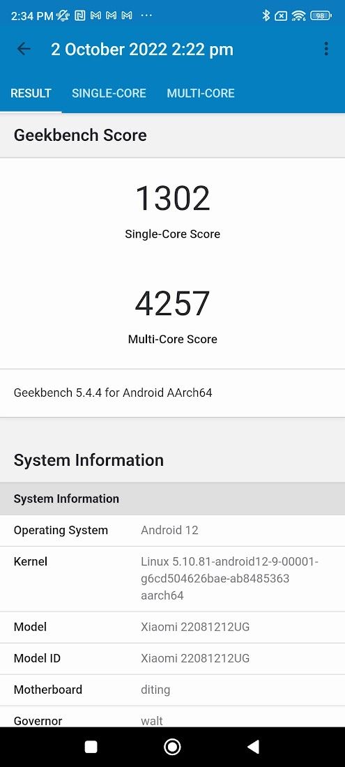 | GeekBench 5 | چند هستهای: ۴۲۵۷ | تکهستهای: ۱۳۰۲ |