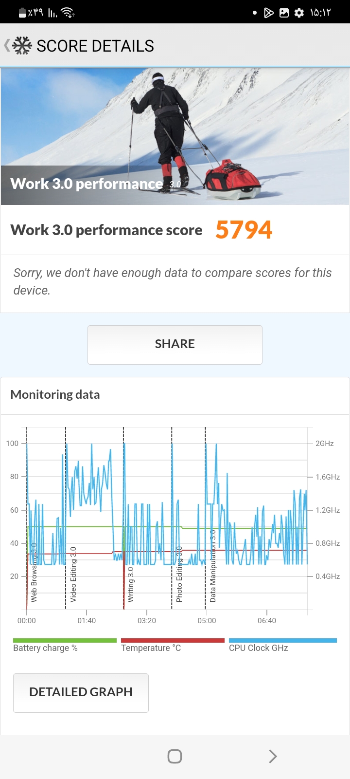 در استفادههای روزانه به جز کمی کندی سرعت مشکلی دیگری با گوشی نخواهید داشت و همه چیز در حالت نسبتا خوبی اجرا میشود. با این حال این گوشی توان پردازشی بالایی ندارد و برای اجرای بازیهای جدید مناسب نیست. برای درک بهتر این موضوع از بنچمارکهایی از جمله GeekBench، 3D Mark و PC Mark استفاده کردیم. میتوانید نتایج این تستها را در ادامه مشاهده کنید.