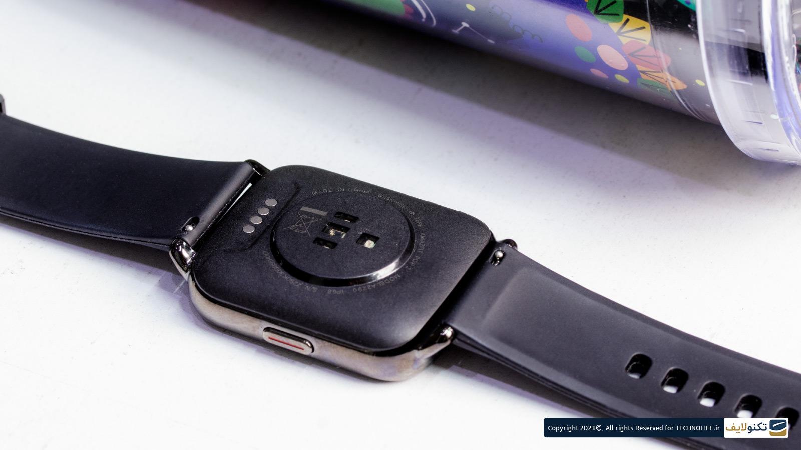 جنس فریم آن آلومینیومی و برای پشت ساعت نیز بدنهای از جنس پلی کربنات در نظر گرفته شده است. قسمت بالای ساعت دارای یک میکروفون، لبه سمت راست آن دارای یک دکمه فیزیکی ساخته شده از فولاد ضد زنگ، لبه پایینی خالی است و کمی عقبتر از لبه سمت چپ میکروفون قرار دارد. با استفاده از بند سیلیکونی که قفل سگکی نیز دارد میتوانید ساعت را دور مچ دستتان ببندید و از آن استفاده کنید. این بند قابل تعویض است و میتوانید در صورت نیاز آن را به راحتی باز کنید. برای محافظت از ساعت در برابر آب و گرد و غبار برای آن از فناوری ip68 استفاده شده است.