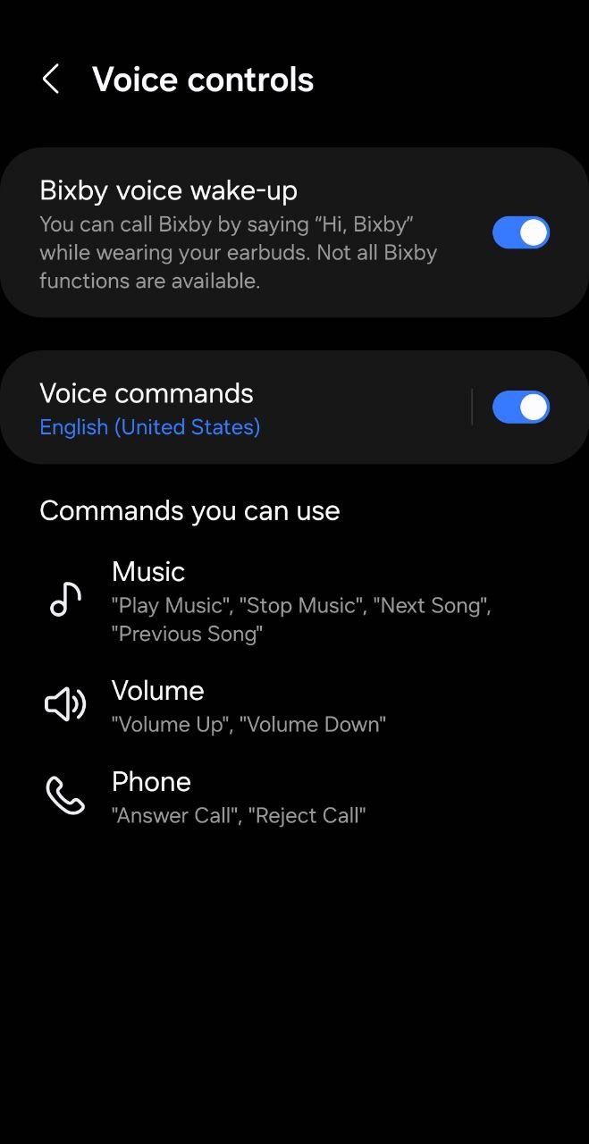 وقتی داخل اپلیکیشن Wearable وارد میشوید. روی Earbuds settings ضربه بزنید و وارد بخش Voice controls شوید. در صفحه جدید میتوانبد قابلیت Voice controls را فعال کنید و عباراتی که برای تغییر باید بیان کنید را مشاهده کنید. توجه داشته باشید که برای کنترل موزیک و تماس بدون هرگونه لمسی دقیقا باید همین جملات را استفاده کنید.همچنین میتوانید با فعال کردن دستیار صوتی بیکسبی به آن فرمان دهید و از این قابلیت هم نهایت استفاده را به نفع خود ببرید.