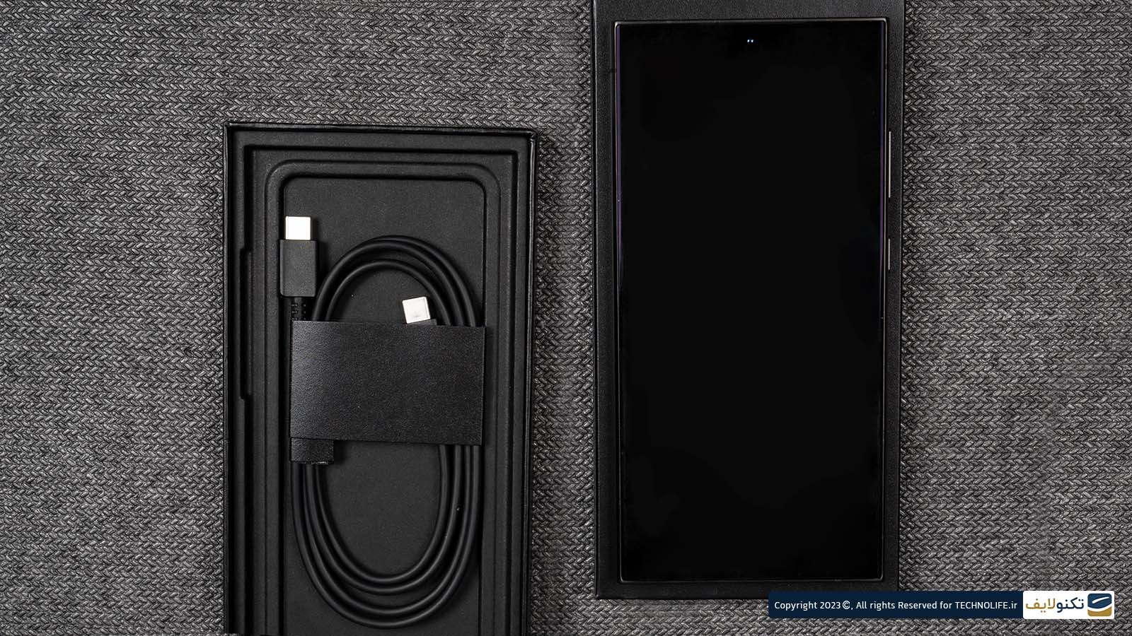 قبل از پرداختن به بررسی s24 اولترا، لازم است که نگاهی به محتویات داخل جعبه این گوشی جذاب بیندازیم، جعبهای که حالا مقداری باریکتر از قبل شده و همانطور که در عکس مشاهده میکنید، سیم Type-C به Type-C را شامل میشود. به غیر از این سیم و خود گوشی، درون جعبه یک دفترچه راهنما و یک سوزن سیمکارت نیز دیده میشود و طبق انتظار باید آداپتور را بهصورت مجزا خریداری کنید.