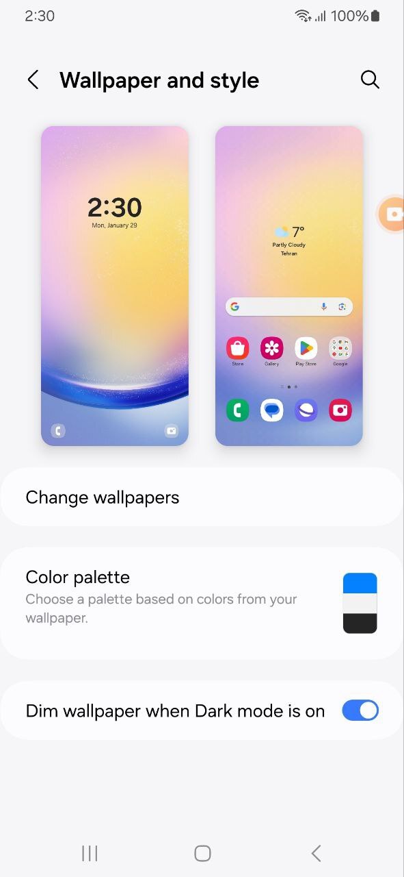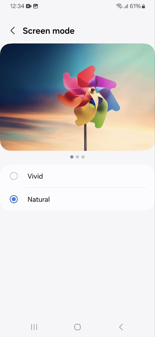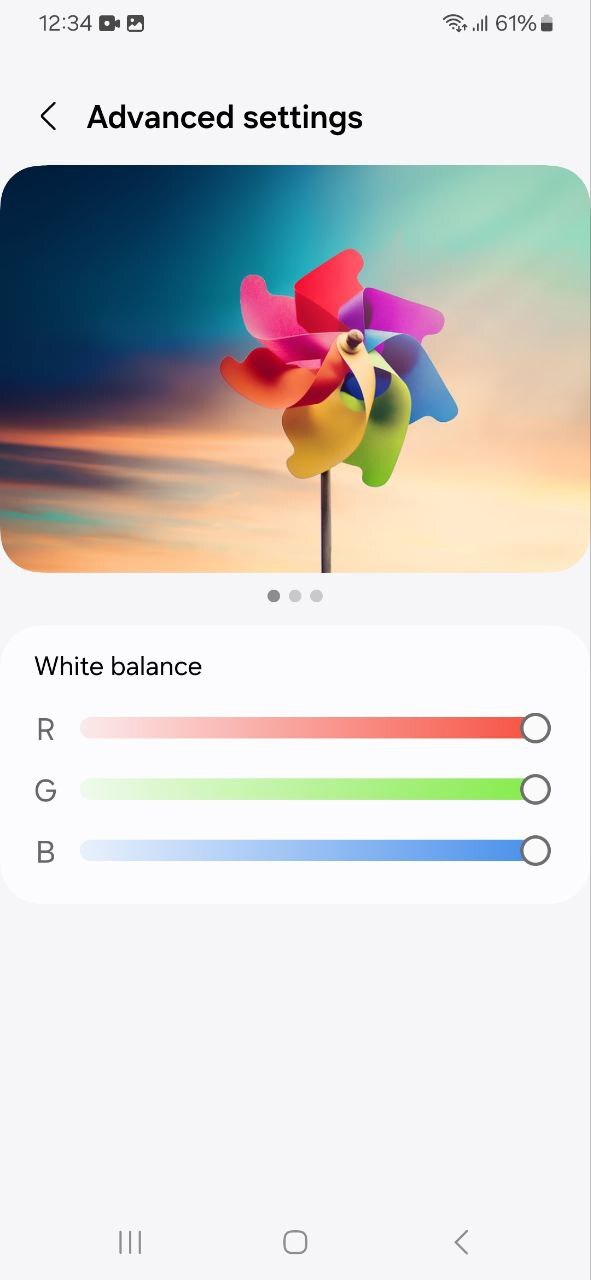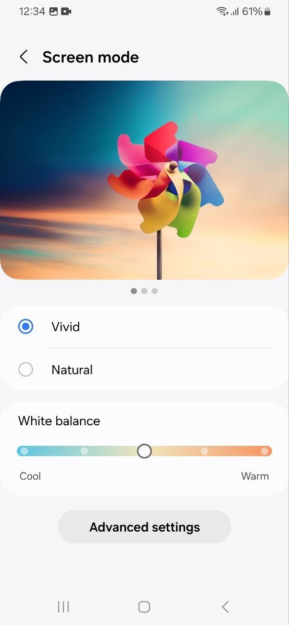 در ادامه این تنظیمات هم میتوان گفت که بخش Screen mode صفحه نمایش هم به صورت پایه روی حالت vivid قرار دارد و در صورتیکه بخواهید رنگها را گرمتر و با زردی و قرمزی بیشتری مشاهده کنید هم میتوانید روی حالت Natural قرار دهید. اگر هم که روی Advanced setting ضربه بزنید، میتوانید میزان گرمی و سردی رنگها را با نوار طراحی شده به سمت راست یا چپ بکشید.