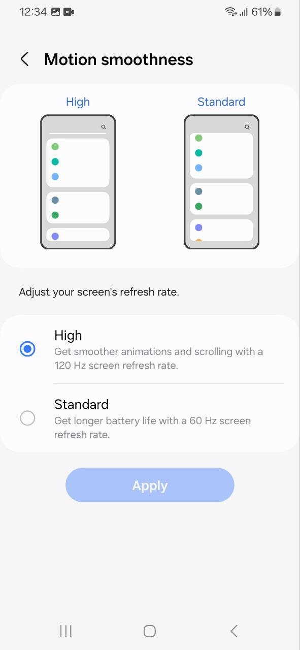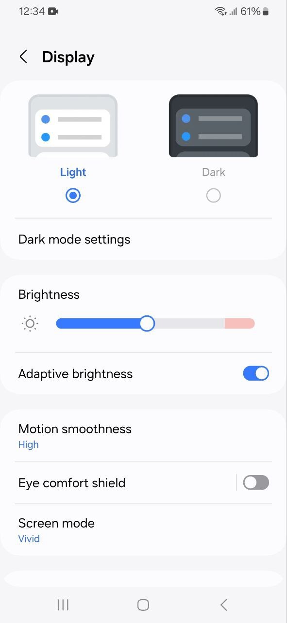 در قسمت تنظیمات گوشی در بخش Display میتوانید انتخاب کنید که گوشی روی حالت دیفالت یعنی Light mode باشد یا Dark mode! علاوهبر این میزان روشنایی (Brightness) را هم میتوانید به صورت دستی تغییر دهید یا گزینه Adaptive Brightness را روشن کنید تا گوشی به صورت اتوماتیک تشخیص دهد که مطابق با نور محیط تا چه اندازه نور صفحه نمایش را باید کم یا زیاد کند. گزینه Motion smoothness هم کاملا قابل انتخاب است. اگر روی حالت استاندارد باشد، نرخ نوسازی 60 هرتز را خواهید داشت و اگر روی High قرار بگیرد، نرخ نوسازی 120 هرتز را نمایش خواهد داد.