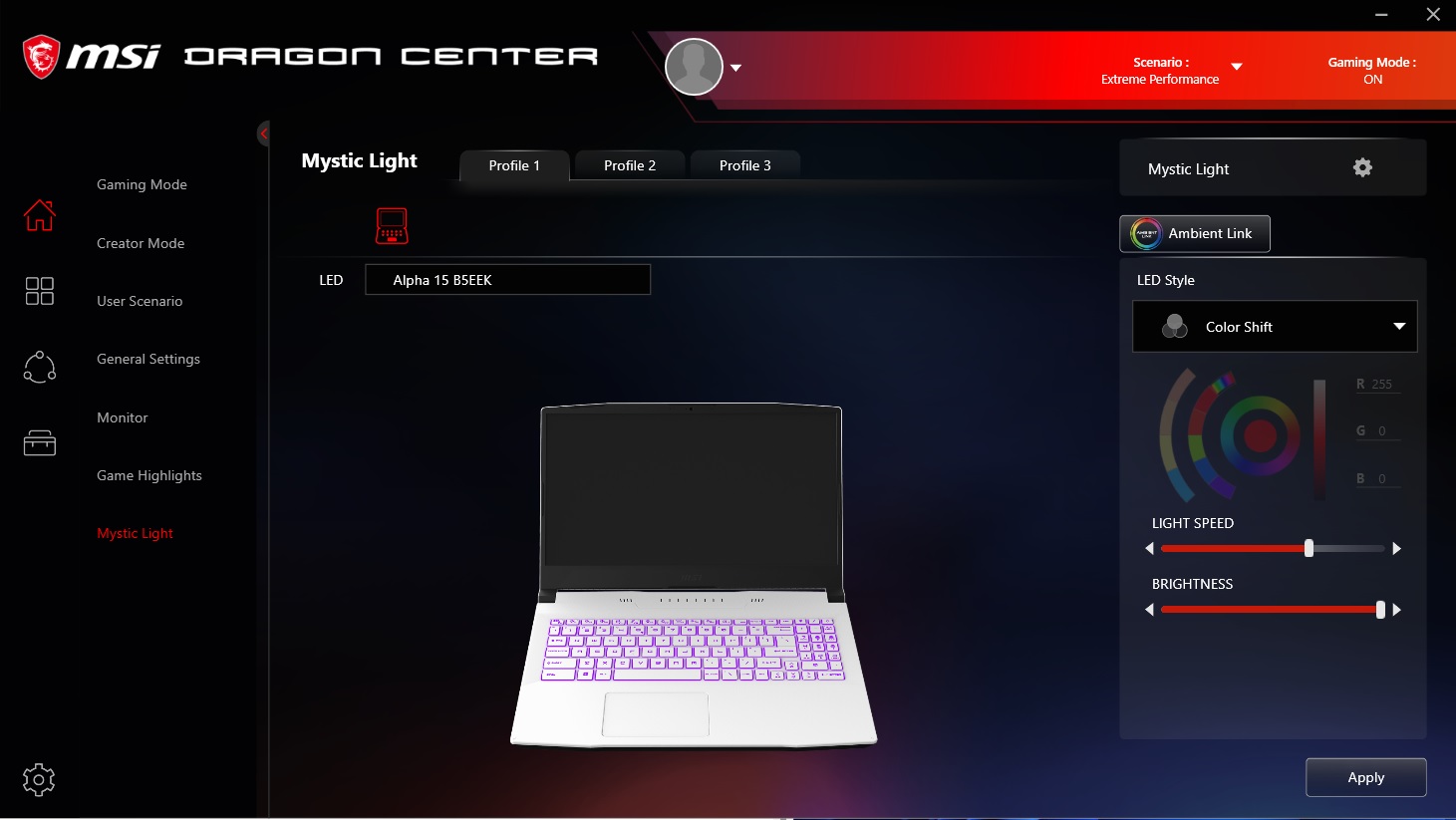 شرکت ام اس ای برای این لپ تاپ های گیمینگ خودش از جمله لپ تاپ گیمینگ آلفا ۱۵ اپلیکیشنی به نام MSI Center را عرضه کرده که پیشنهاد میکنیم آن را پس از خرید این لپ تاپ نصب کنید. این اپلیکیشن به کاربران اجازه میدهد که بتوانند قسمتهای مختلف لپ تاپ را زیر نظر داشته باشند و حتی تغییراتی در آن ایجاد کنند. به طور مثال با استفاده از اپلیکیشن MSI Center میتوانید نور پسزمینه صفحه کلید را تغییر دهید. میتوانید نور پسزمینه را به رنگهای RGB تغییر دهید و حتی شدت روشنایی آن را هم تغییر دهید. در کنار تغییر رنگ نور پسزمینه میتوانید حالت نمایش نور را هم تغییر دهید. میتوانید نور را به صورت ثابت در بیاورید یا میتوانید به نمایش نورها حرکت بدهید تا به شکل و شمایلی خاص نورها دور صفحه کلید حرکت کنند و یا خاموش و روشن شوند.