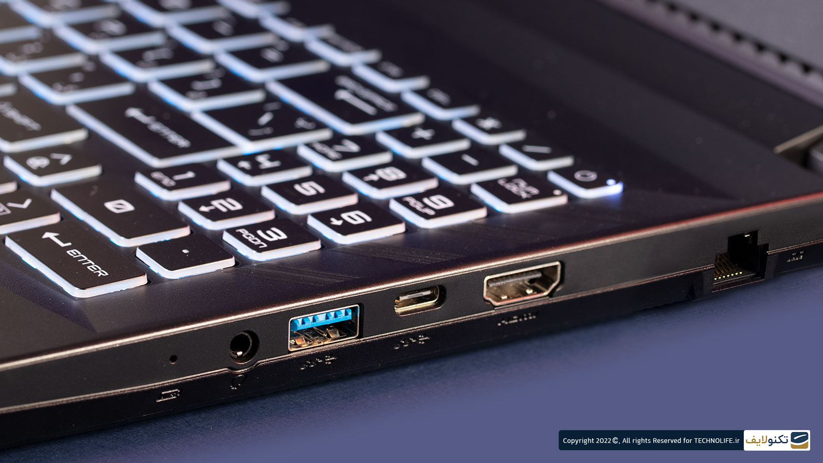 در ادامه بررسی لپ تاپ گیمینگ ام اس ای Alpha 15 B5EEK-066XML باید به تنوع پورتهای این محصول هم اشاره کنیم. روی لبه سمت چپ آلفا ۱۵ دو عدد پورت USB و دریچه تحویه هوا را مشاهده میکنید. روی لبه سمت راست هم جک ۳٫۵ میلیمتری خروجی صدا، خروجی HDMI، پورت USB-C و پورت شبکه دیده میشود. روی لبه پشتی لپ تاپ هم دریچههای دیگری برای تحویه هوا را مشاهده میکنید.