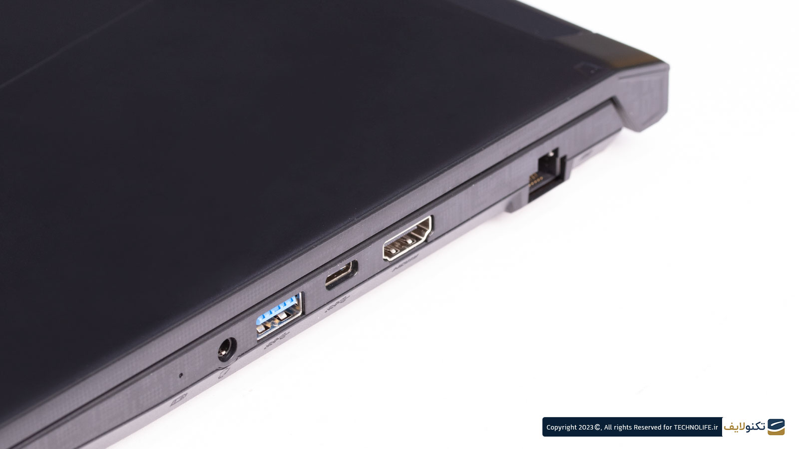 روی لبه سمت راست این لپ تاپ خروجی HDMI، پورت USB-C، پورت USB، جک ۳٫۵ میلیمتری صدا و پورت شبکه دیده میشود.