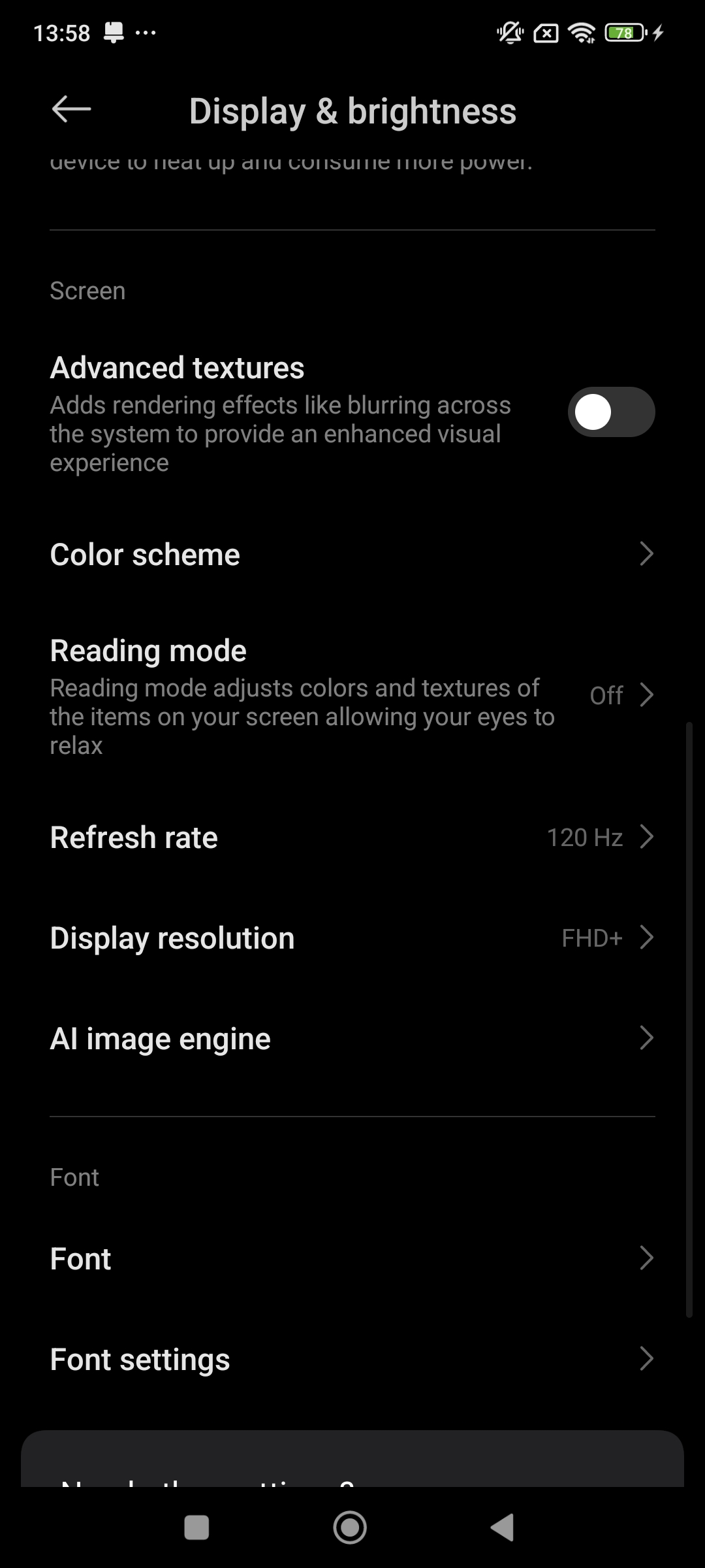 از تنظیمات دیگری که با ورود به بخش Display & Brightness دریافت خواهید کرد میتوان به موارد حالت دارک مود، تنظیمات میزان روشنایی صفحهنمایش، حالت استفاده زیر نور خورشید، تنظیمات رنگی، فعال کردن قابلیت Reading Mode، فونت، تنظیم کیفیت صفحه نمایش بین دو حالت FHD+ و WQHD+ و تنظیمات فونت اشاره کرد.