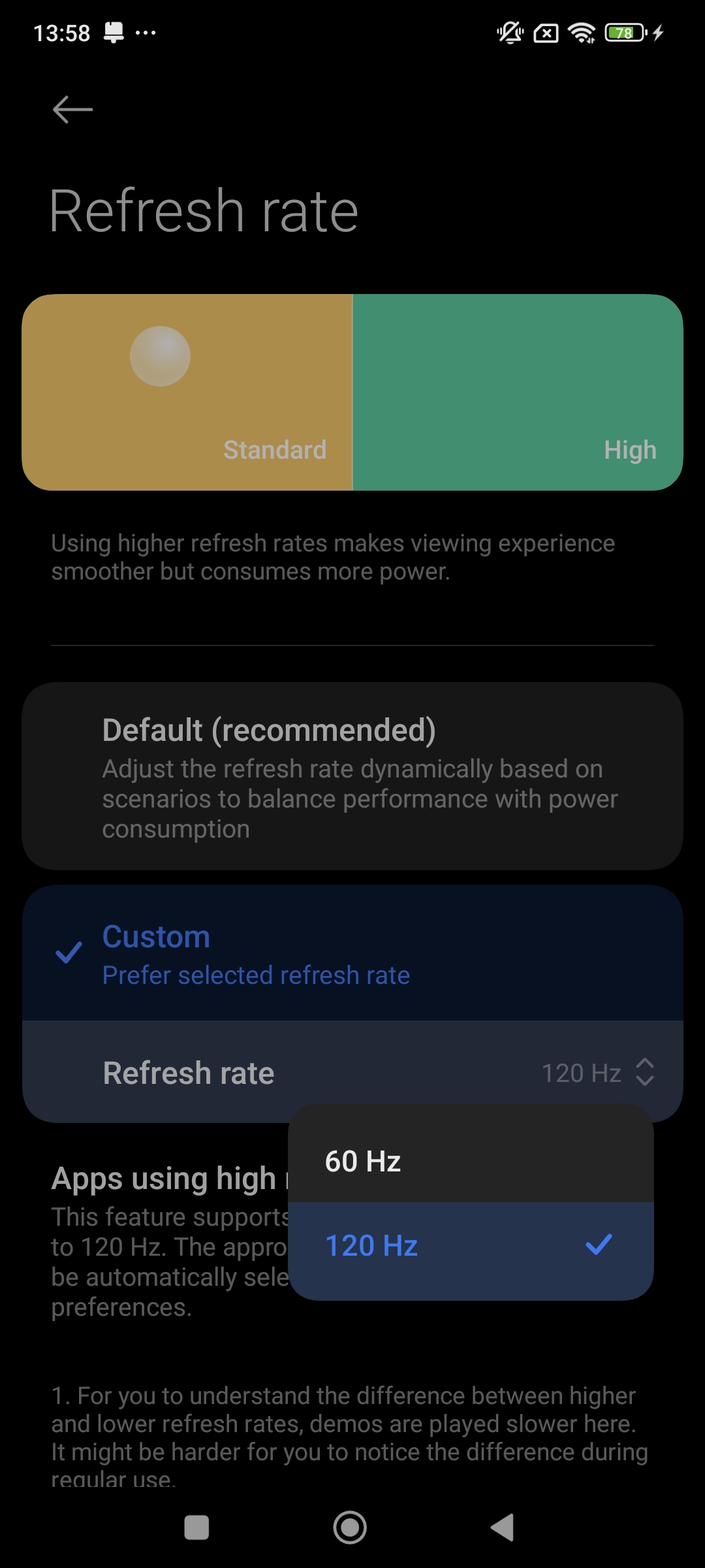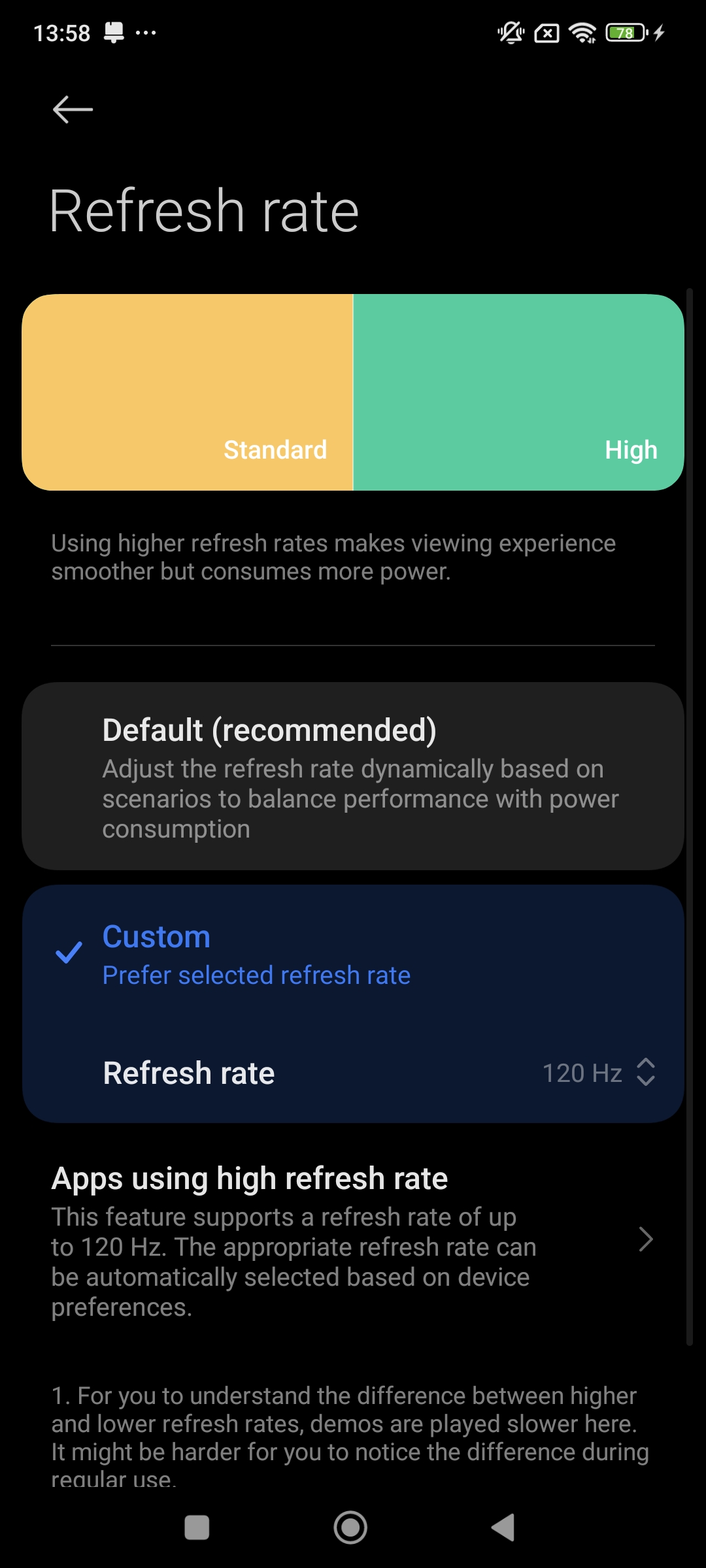 تفاوت اساسی بین حالتهای پیش فرض و حالت Custom این است که حالت دوم تنظیمات بسیار خوبی را برای هر برنامه ارائه میکند و میتوانید تعیین کنید که کدام برنامهها باید از نرخ تازهسازی بالا استفاده کنند و کدام نه.