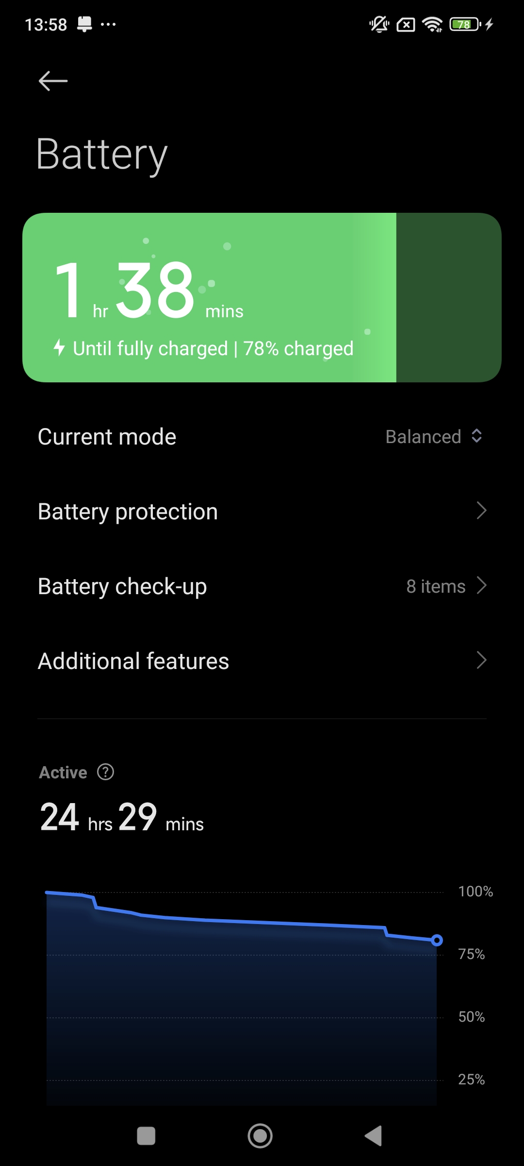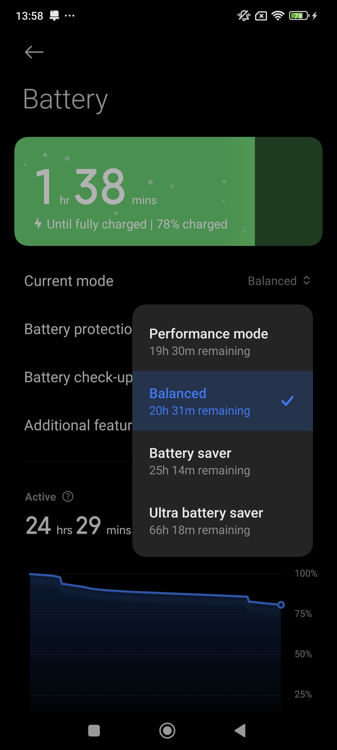 درست مانند سایر گوشیهای شیائومی با قابلیت شارژ 120 واتی، این گوشی نیز دارای حالت Boost Charge است. قبل از شارژ کردن میتوانید با ورود به بخش تنظیمات این قابلیت را فعال کنید و توجه داشته باشید که این قابلیت زمانی شروع به کار میکند که صفحهنمایش خاموش باشد و دلیل این کار نیز پیشگیری از داغ شدن بیش از حد دستگاه است. در طی این فرایند شارژ سریع گوشی داغ نمیکند؛ اما مقدار قابل توجهی گرم میشود. در بخش تنظیمات باتری نیز چهار گزینه Performance Mode، Balanced، Battery Saver و Ultra Battery Saver قرار گرفته که هر کدام مصرف باتری متفاوت و عملکرد باتری متفاوتی را در اختیارتان قرار میدهند.