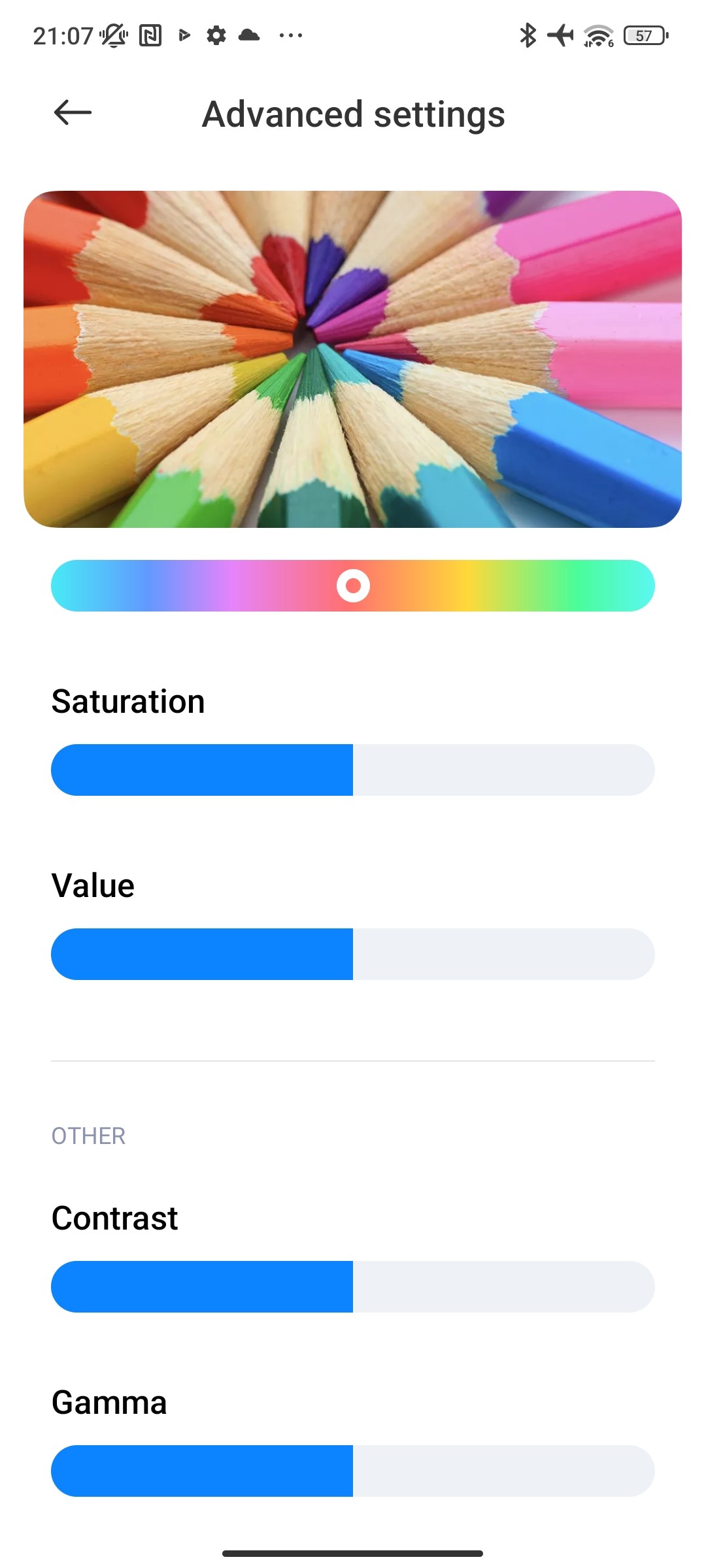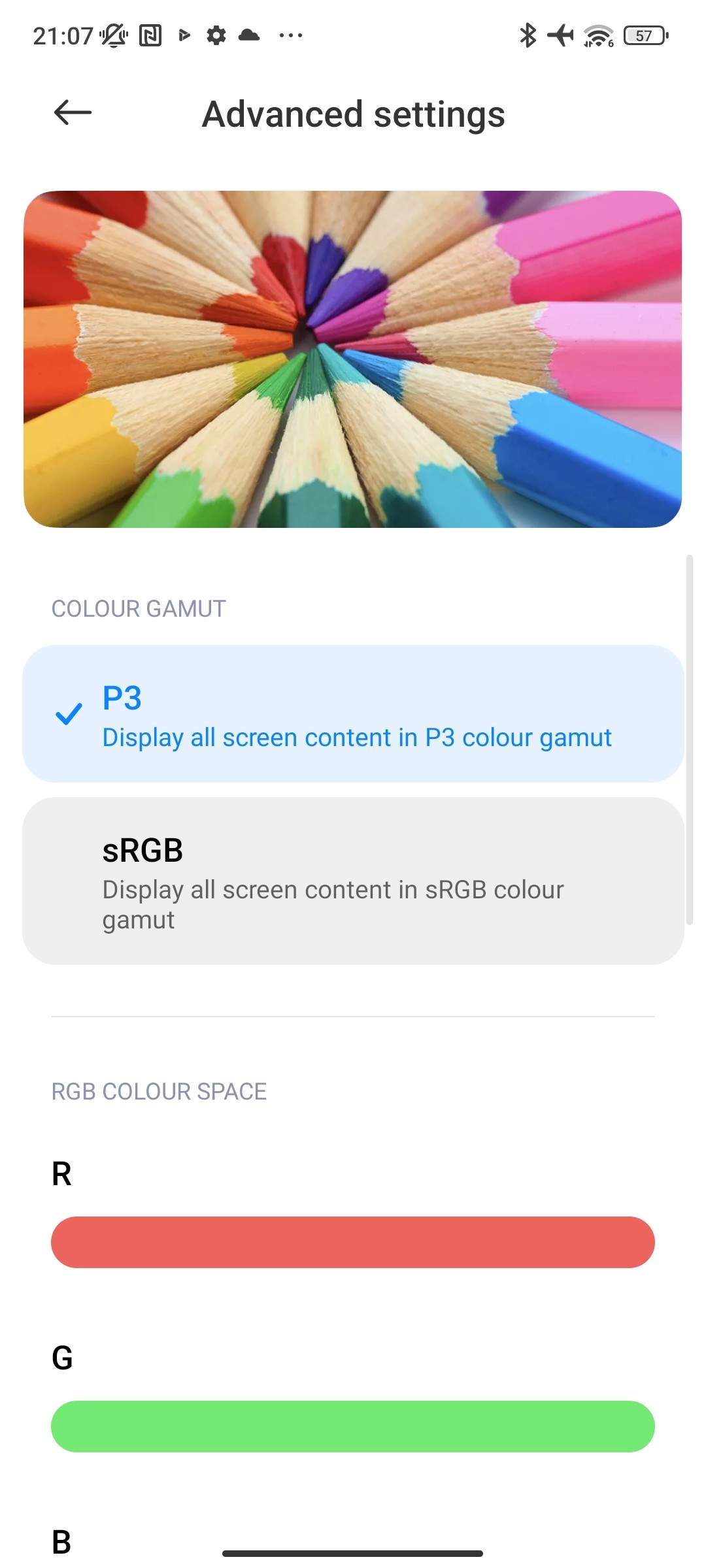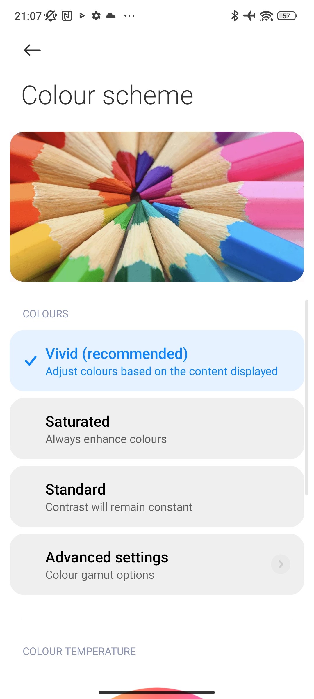 در بررسی پوکو x5 pro باید به پوشش رنگی صفحه نمایش گوشی اشاره کنیم. صفحه نمایش این گوشی هوشمند از پوشش رنگی DCI-P3 پشتیبانی میکند. در حالت پیش فرض سه حالت نمایش رنگ برای این گوشی در نظر گرفته شده که Vivid و Saturated و Standard نام دارند. حالت استاندارد پوشش رنگی sRGB را نشان میدهد. با این حال تمام این تنظیمات به شما امکان شخصیسازی هم میدهند و میتوانید میزان گرمای رنگها را تغییر دهید. به صورت پیش فرض صفحه نمایش روی حالت Vivid قرار گرفته که دقت رنگ مناسبی دارد که البته کمی رنگهای آبی و سفید را قویتر نشان میدهد.