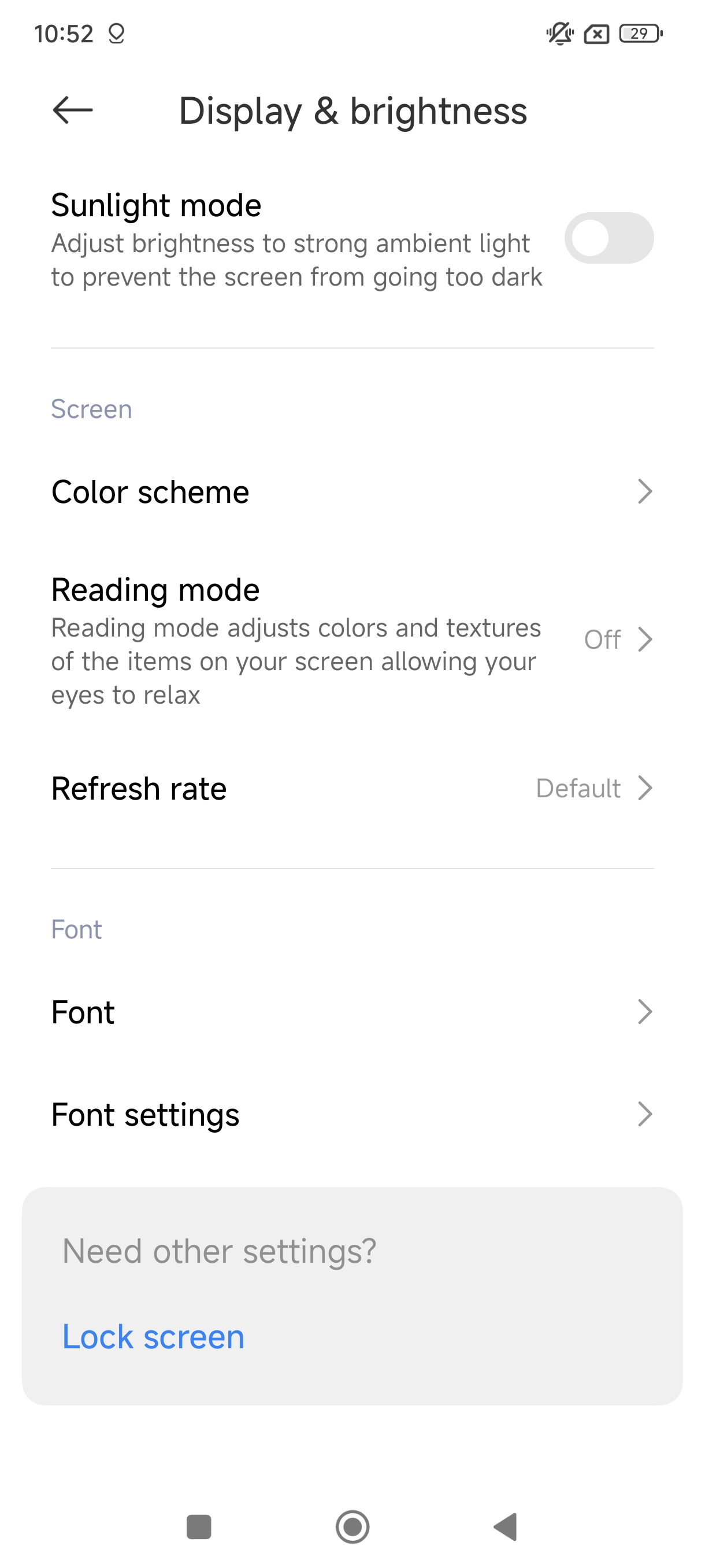 تنظیمات حالت خواندن (Reading Mode)، تنظیمات فونت و تنظیمات قفل صفحهنمایش از دیگر گزینههای قرار گرفته در بخش Display & Brightness هستند. در این بخش از بررسی poco x6 pro این محصول امتیاز بالایی دریافت میکند و کیفیت صفحهنمایش آن با توجه به قیمت بالا است.