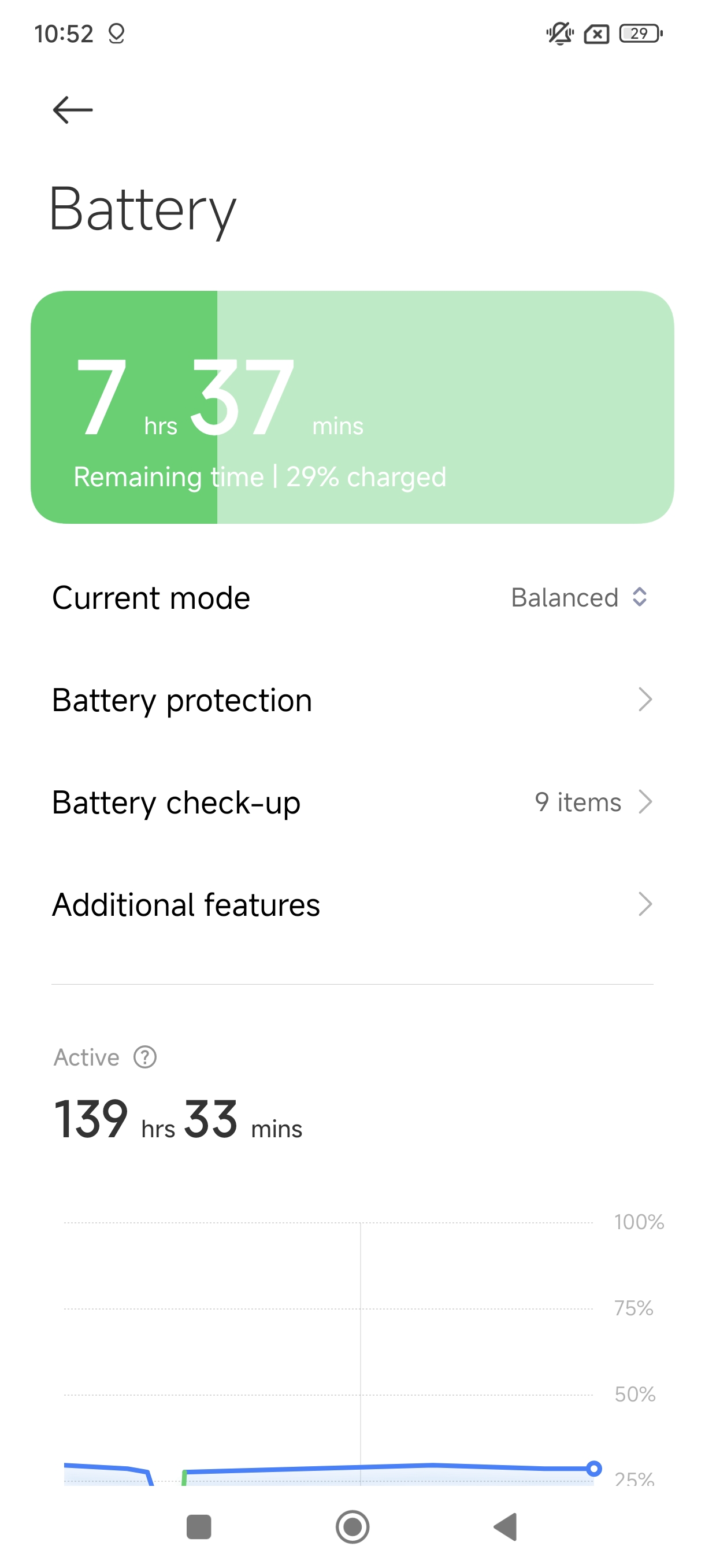 گزینه دیگری به نام Battery Protection در این بخش وجود دارد که دمای باتری و تعداد دفعات شارژ شدن گوشی را نشان میدهد؛ همچنین گزینه دیگری وجود دارد که مدت زمانی که باتری برای شارژ شدن نیاز دارد را تخمین میزند و بعد از آن برای آسیب نرسیدن به گوشی جریان برق را قطع میکند.