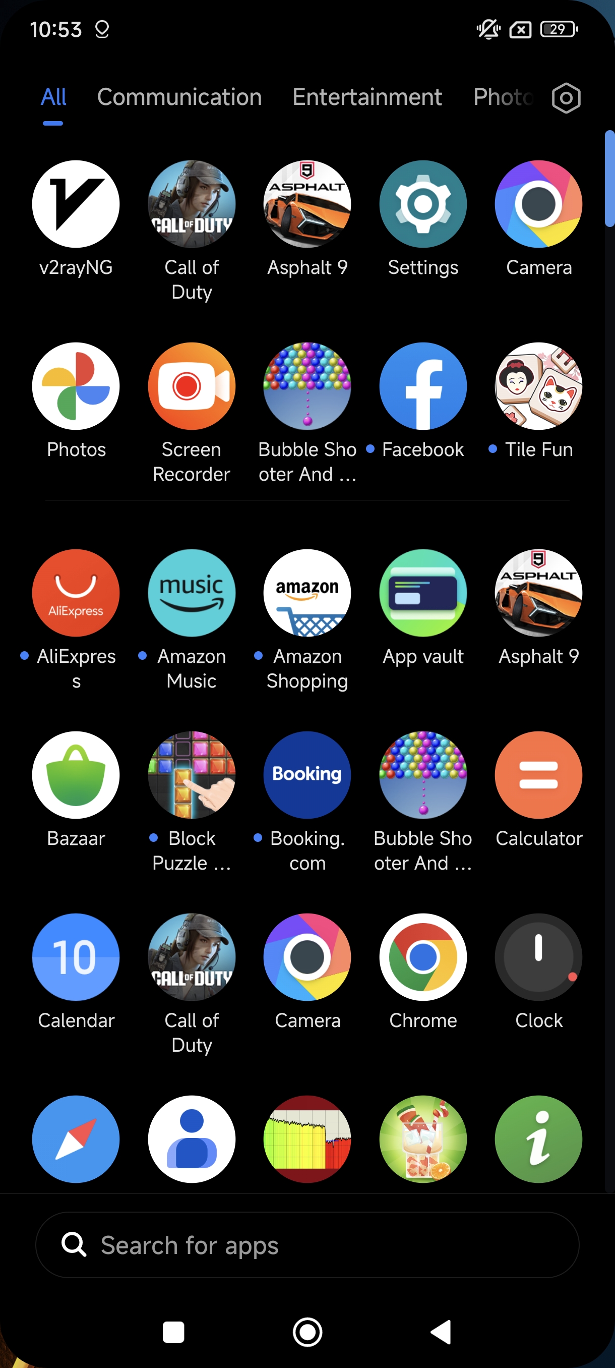منوی برنامههای گوشی دستهبندیهایی دارد که دسترسی و پیدا کردن برنامه مورد نظر را راحت میکند. در بالای منو گزینههای زیادی با نامهای Entertainmet، Communication و غیره وجود دارد که برنامه را مرتبط با آن دستهبندی میتوانید بازی یا پیام رسان مورد نظرتان را پیدا کنید.