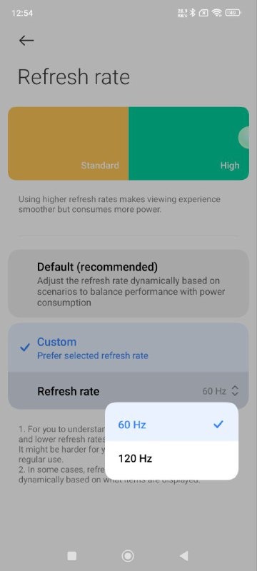 در بخش کاستوم هم میتوانید انتخاب کنید که نرخ نوسازی دائما روی 60 هرتز یا 120 هرتز باشد. همچنین بهتر است بدانید که حداکثر میزان روشنایی یک صفحه نمایش دقیقا در زیر نور آفتاب مشخص میشود، از همین جهت کمپانی شیائومی برای صفحه نمایش گوشی redmi note 13 پرو پلاس عدد 1800 نیت را اعلام کرده است.