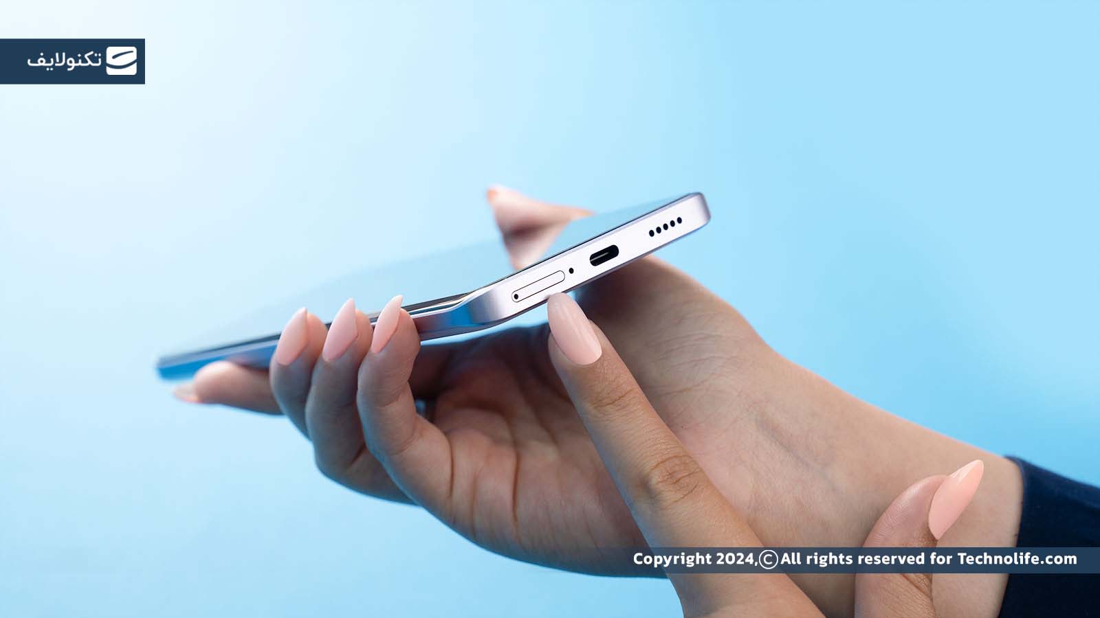 به سمت پایین که چرخش میکنیم، در نگاه اول سوراخهای کوچک اسپیکر نظر ما را به خود جلب میکند که در کنار آن درگاه Type C قرار دارد. روی همین لبه درگاه سیم کارت و میکروفون هم به چشم میآید که در این طراحی جای جک 3.5 میلیمتری صدا خالی است و نبود آن کاملا حس میشود.
